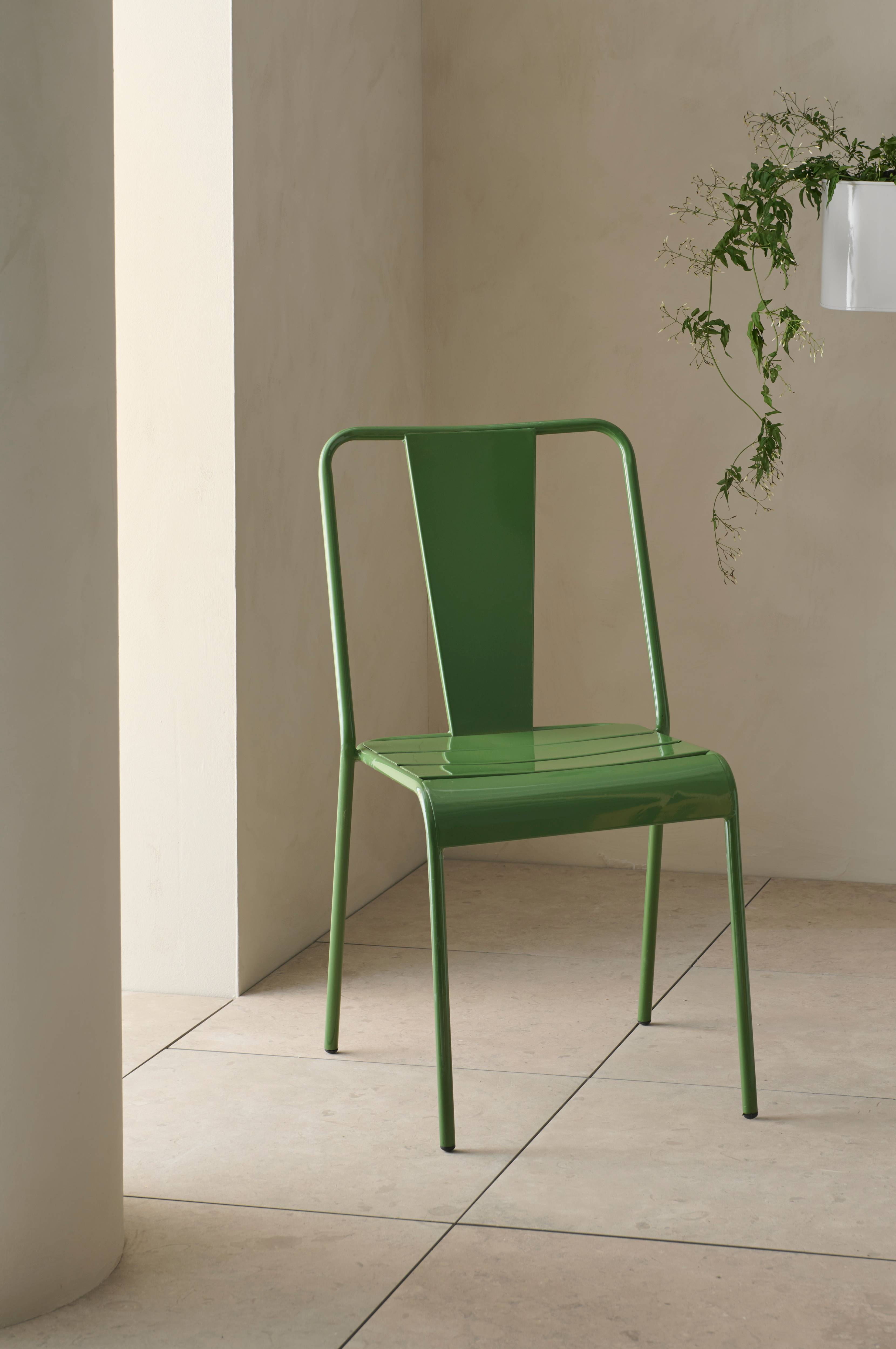 Två stolar av pulverlackad metall med bekvämt rundad framkant. Mått: Bredd 46 cm, höjd 84 cm, djup 54 cm. Sitthöjd 45 cm, sittdjup 40 cm.