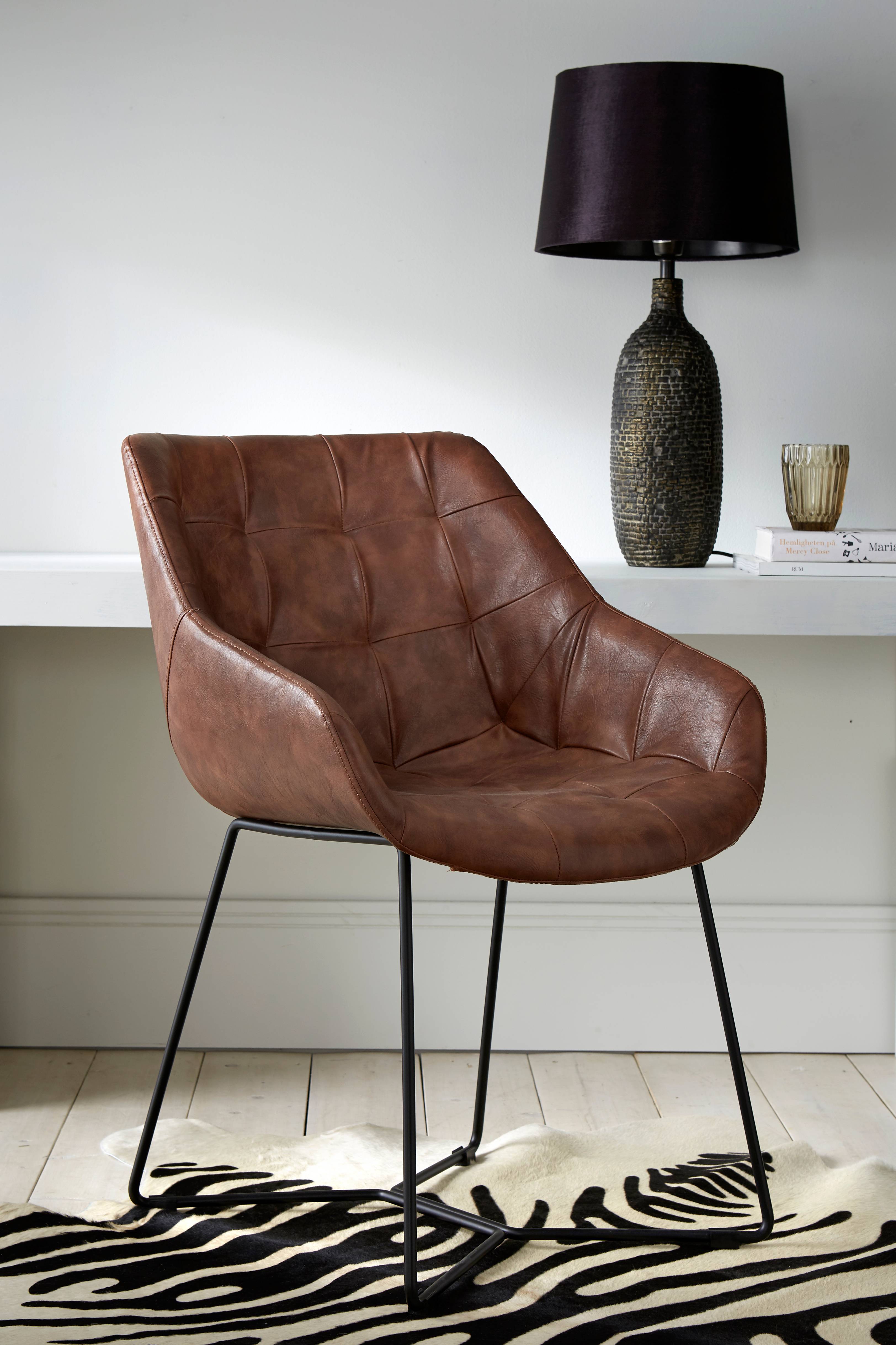 2 stolar med snygg klädsel i skinnimitation av PU som är lätt att torka av. Stomme av plywood, ben av metall och skumstoppning av polyuretan. Bredd 56 cm, höjd 82 cm, djup 63 cm. Sitthöjd 48 cm, sittdjup 44 cm. Armstödshöjd mitten 62 cm. Enklare montering.