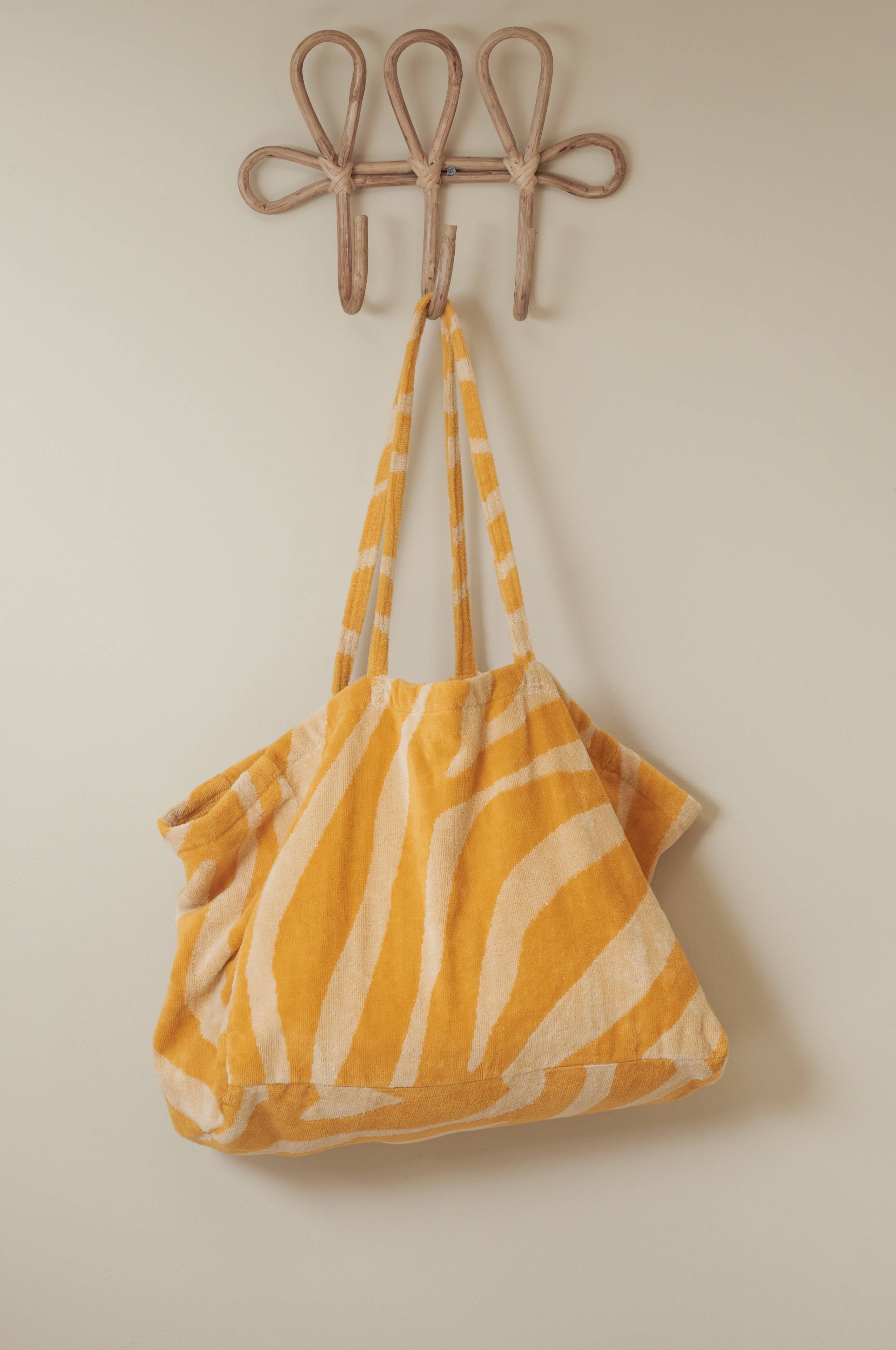 Strandväska i mjuk velour. Två bärhandtag. Mått: B45 x H35 x D22 cm.