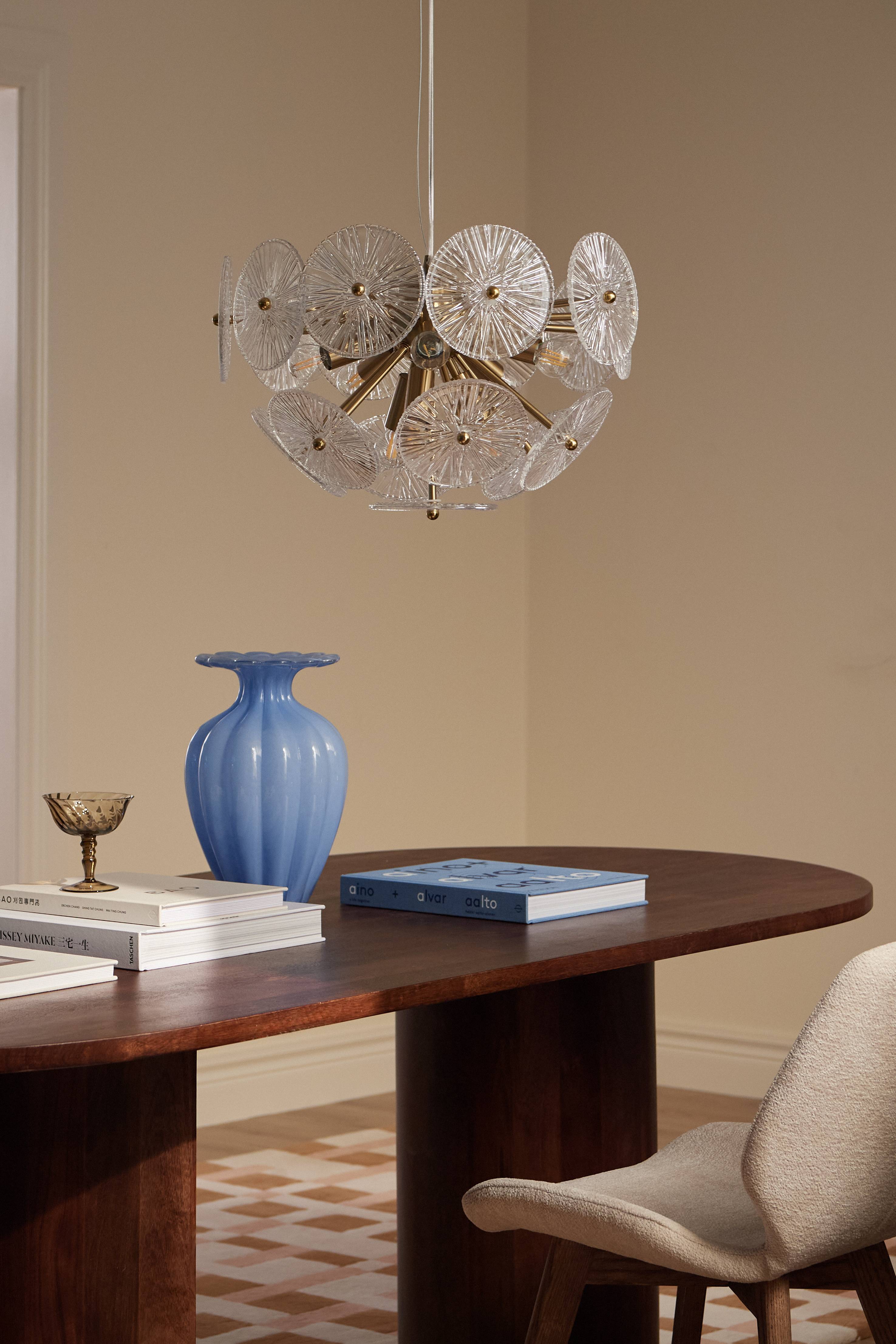 • Taklampa med skivor av strukturerat glas som sprider ljuset • Stomme i metall med mässingfinish • Takkopp i metall med mässingfinish • 8 ljuskällor (ljuskällor medföljer ej)
