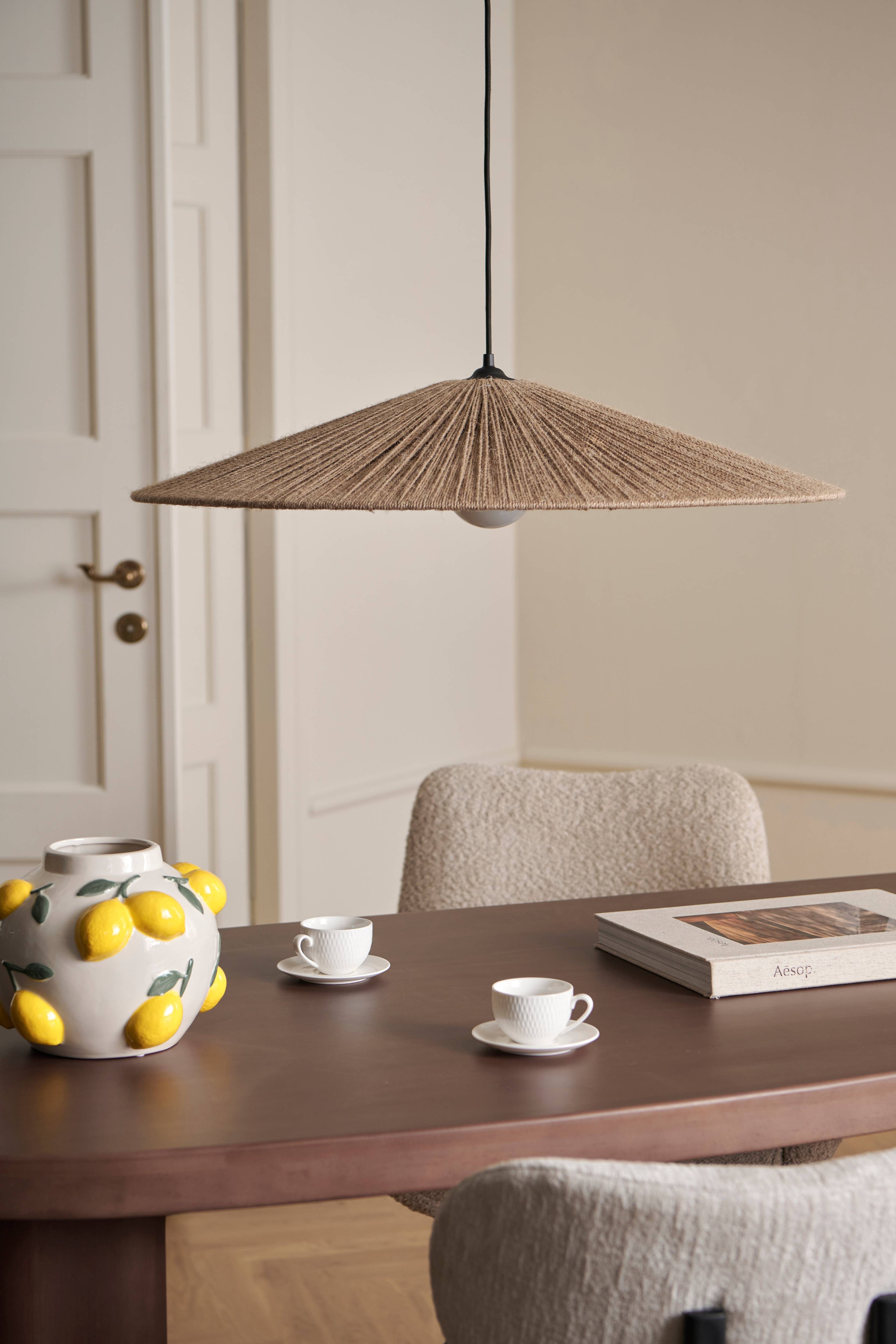 • Taklampa med skärm i flätat rep av jute på en stomme av metall • Svart textilsladd • Ljuskälla ingår ej • Lampan är jordad, klass 1. På grund av EU-regler behövs en separat takkontakt i vissa länder. Takkontakten ska vara jordad (klass 1) och köps separat.