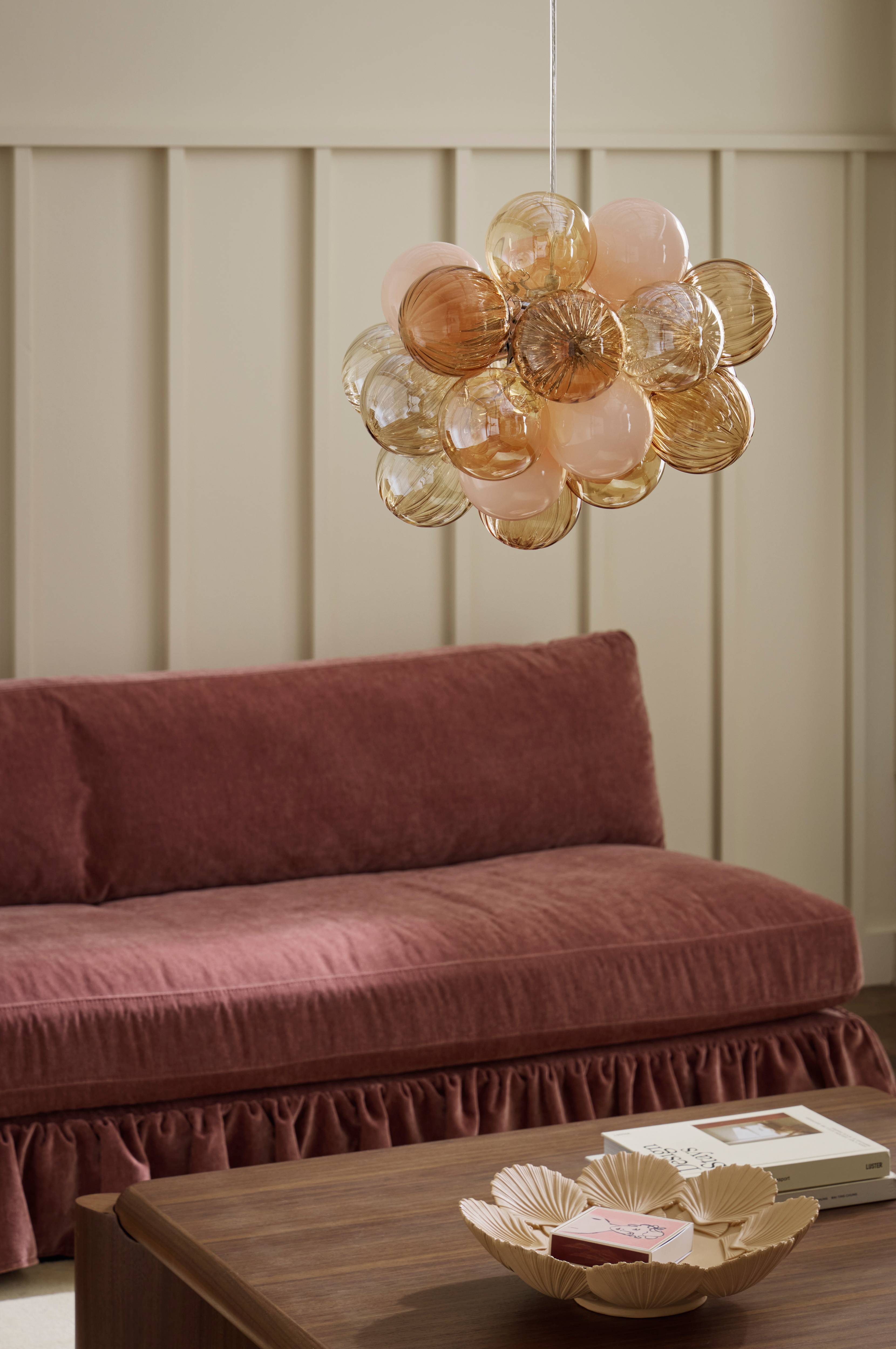 • Taklampa med olikfärgade, olikformade glaskupor• Takkopp i metall• Metallstomme• Plastsladd• Krokupphängning• Fem ljuskällor• Ljuskälla ingår ej• Takkontakt ingår ej (köps separat)