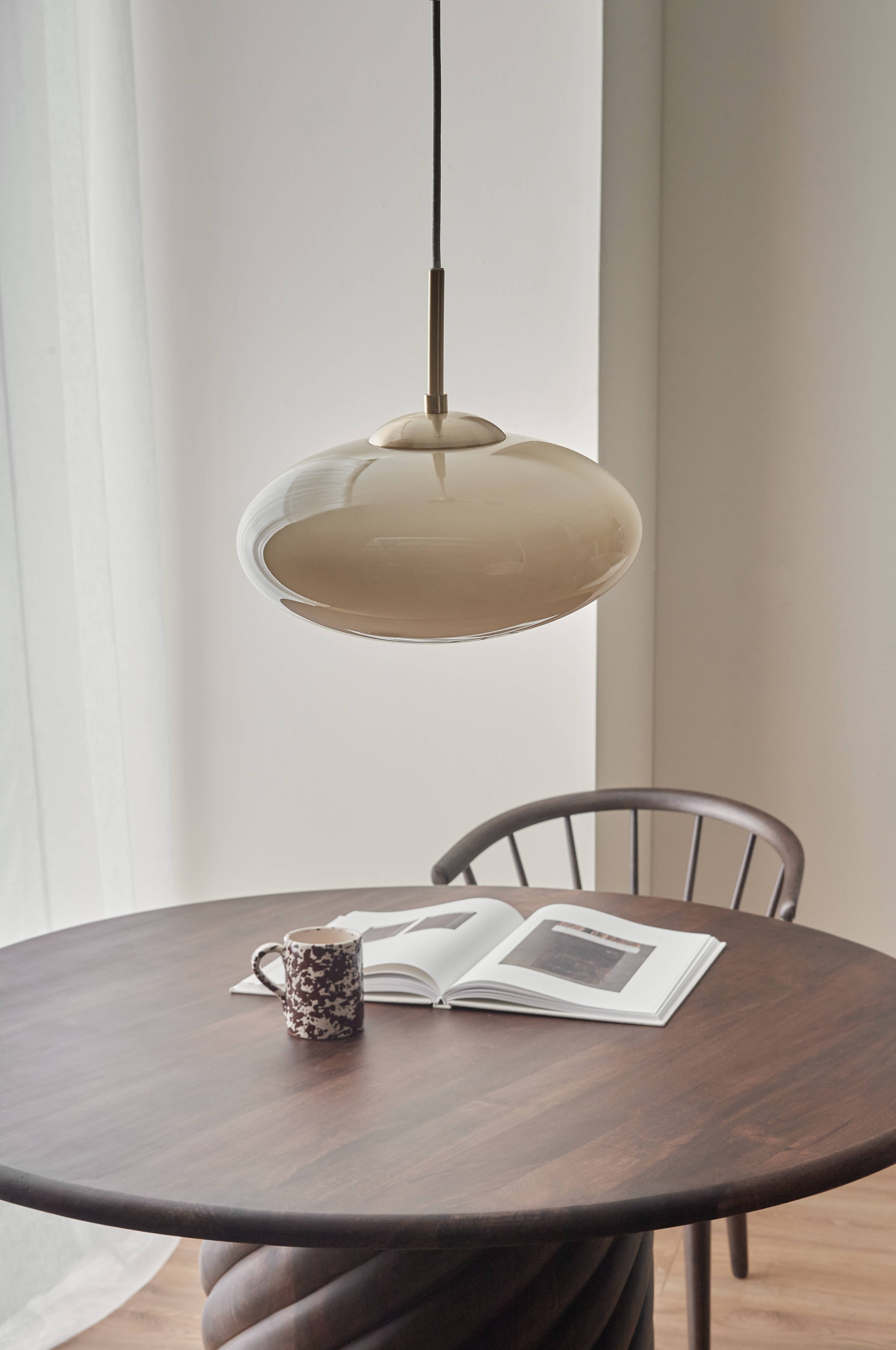 Taklampa av glansigt glas med detaljer och takkopp i metall med borstad mässingfinish. Textilsladd.Jordad.