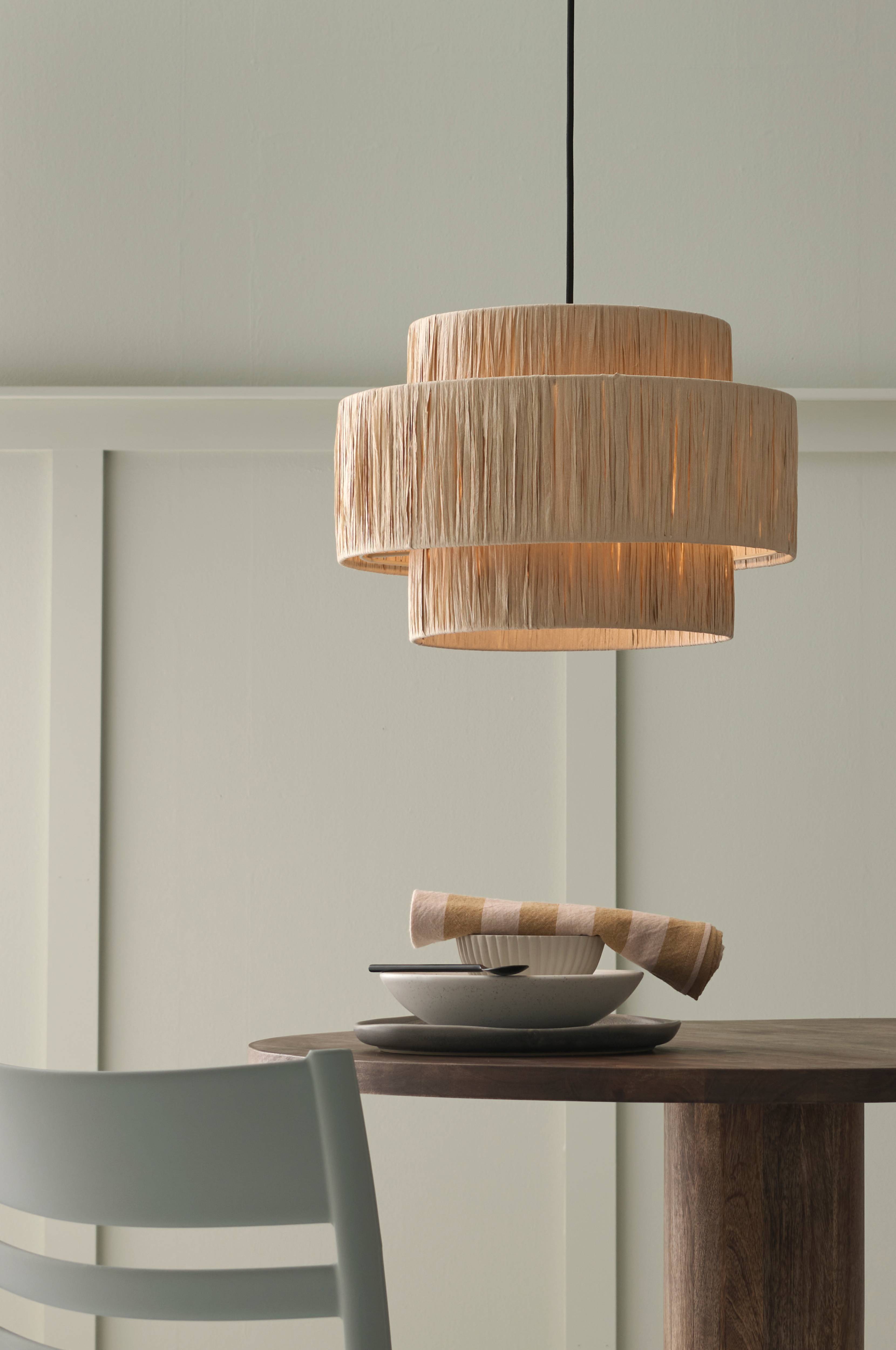 Taklampa av handarbetat pappersstrå, tvinnat på en metallstomme. 3-delad skärm som fästs ihop. Takkopp i svart metall. Skärmens mått: Diameter 40 cm, höjd 28 cm. Höjd från tak ca 135 cm, kan kortas till önskad höjd. Svart textilsladd. Monteras med bygel. Ljuskälla ingår ej.