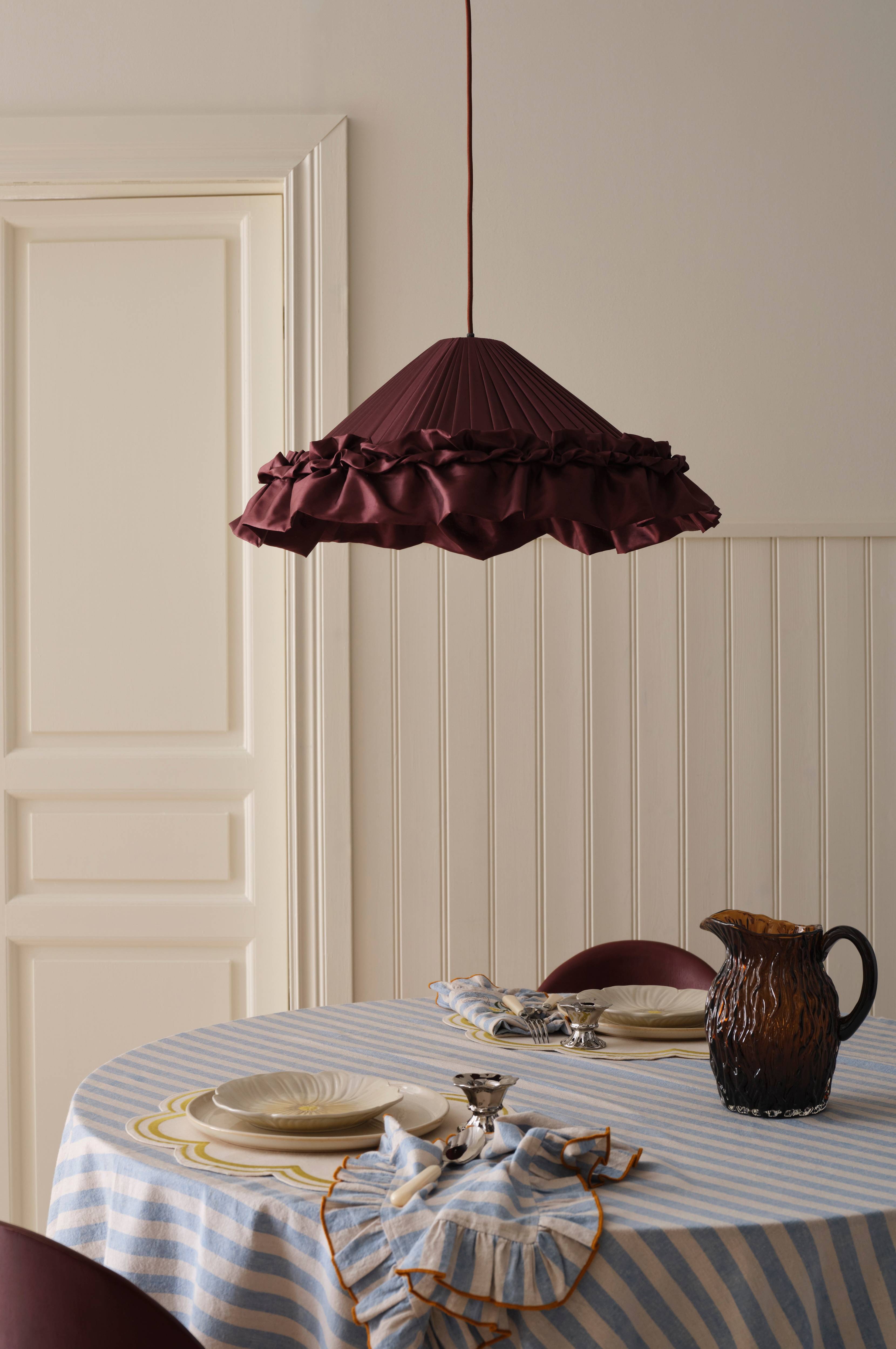 • Plisserad taklampa i tyg med dekorativ volangkant• Metallstomme• Takkopp i plast• Textilsladd• Krokupphängning• Ljuskälla ingår ej• Takkontakt ingår ej (köps separat)