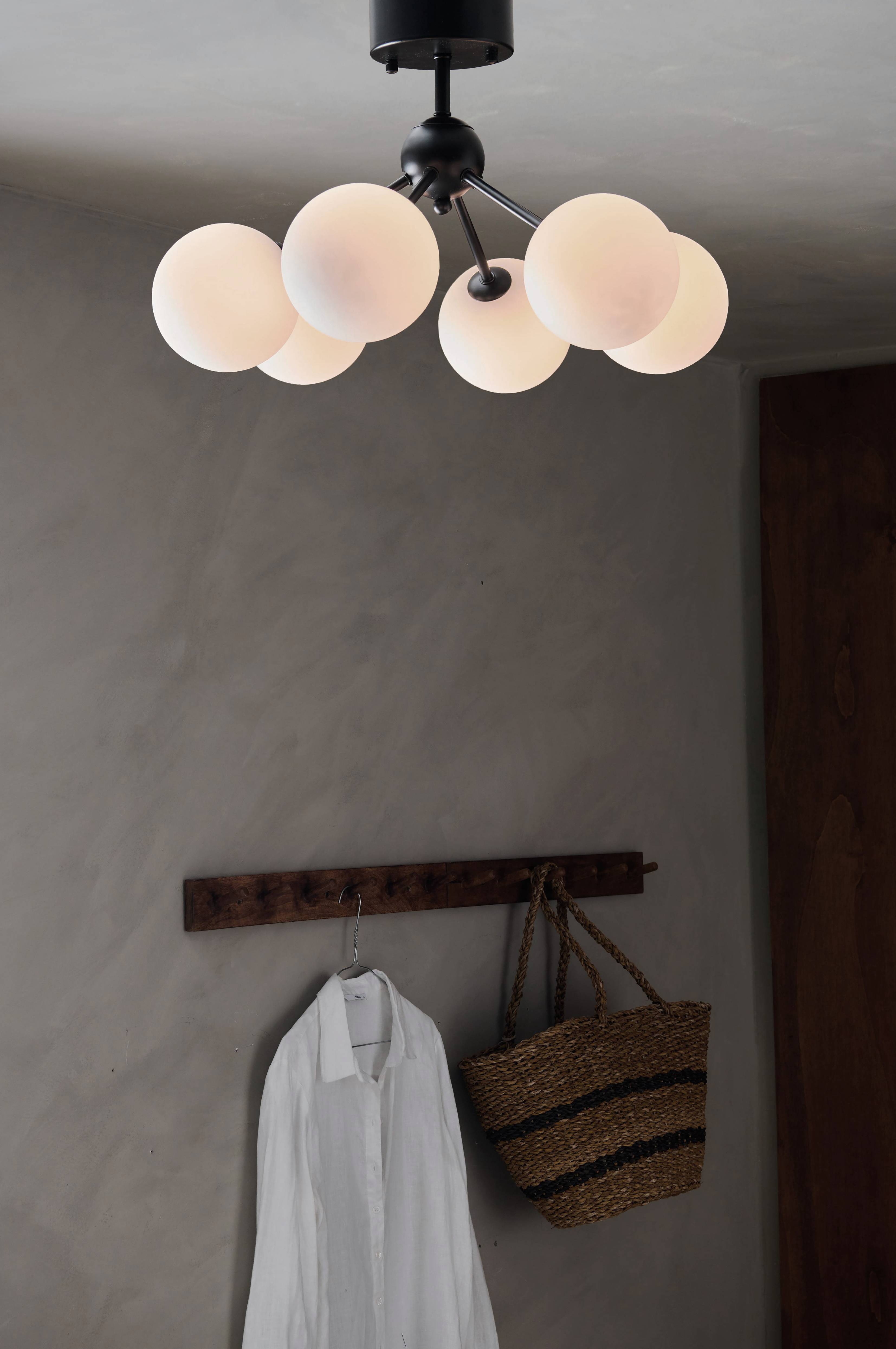 Takplafond i mässingsfärgad metall eller pulverlackad svart metall med 6 st opalvita glaskupor som fästs/lossas med skruvfunktion. Totala mått på monterad lampa: Höjd 32 cm, diameter 50 cm. Diameter på glaskuporna 12 cm. Takkopp i metall. Monteras med bygelupphäng. Sockel 6xG9 LED max 18 W.