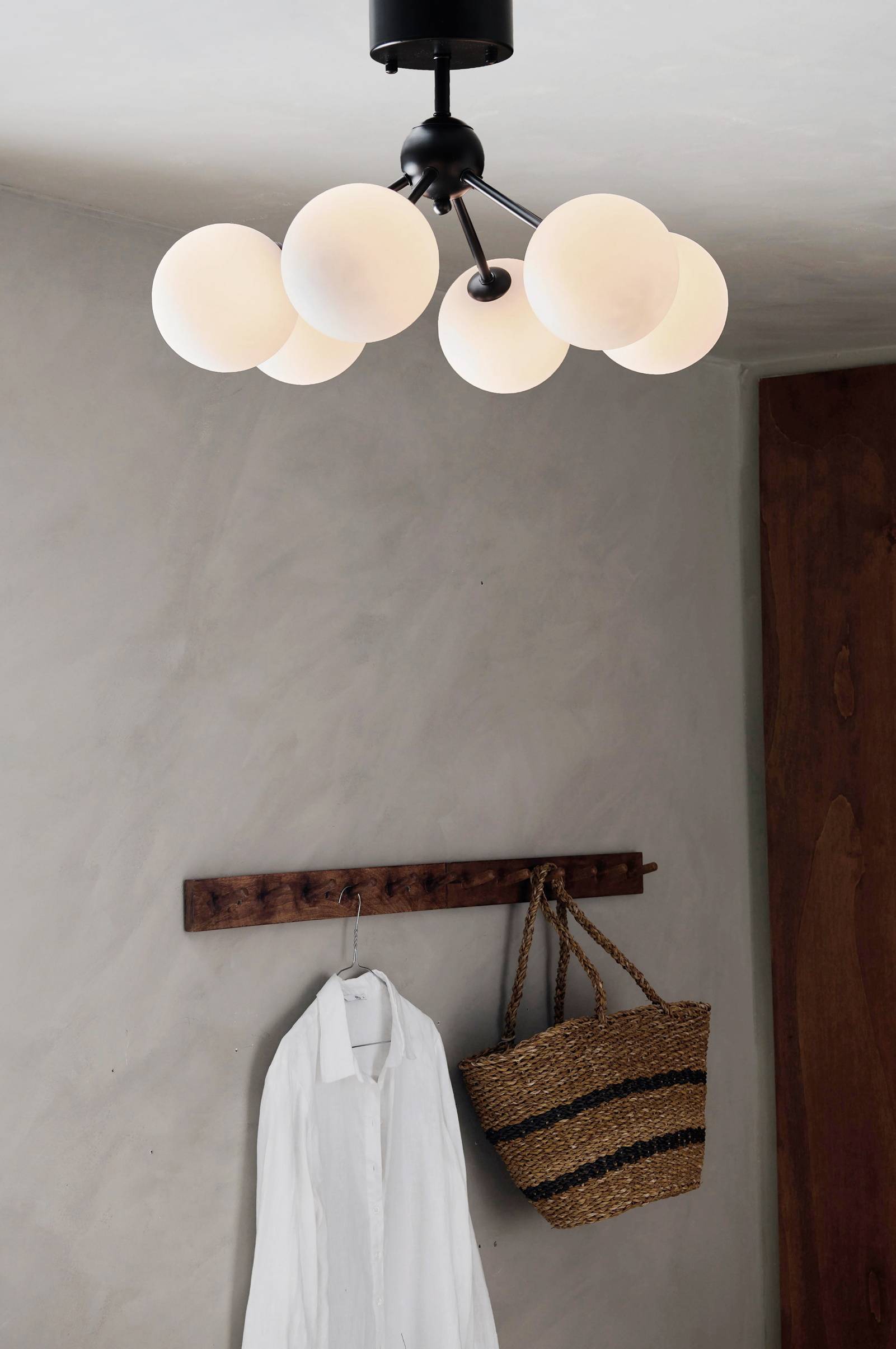 Takplafond i mässingsfärgad metall eller pulverlackad svart metall med 6 st opalvita glaskupor som fästs/lossas med skruvfunktion. Totala mått på monterad lampa: Höjd 32 cm, diameter 50 cm. Diameter på glaskuporna 12 cm. Takkopp i metall. Monteras med bygelupphäng.