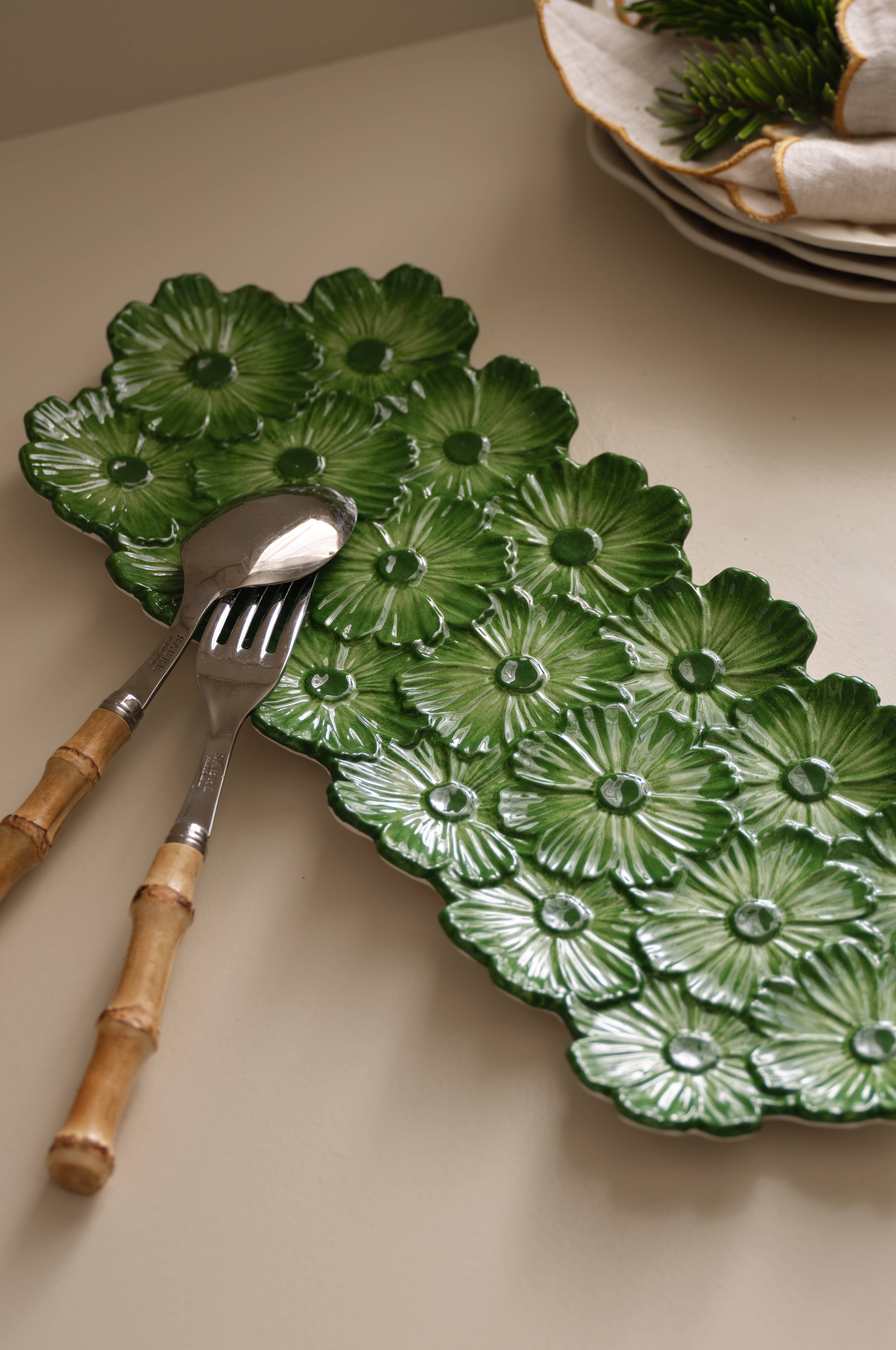 • Uppläggningsfat i glaserad keramik med handmålad finish
