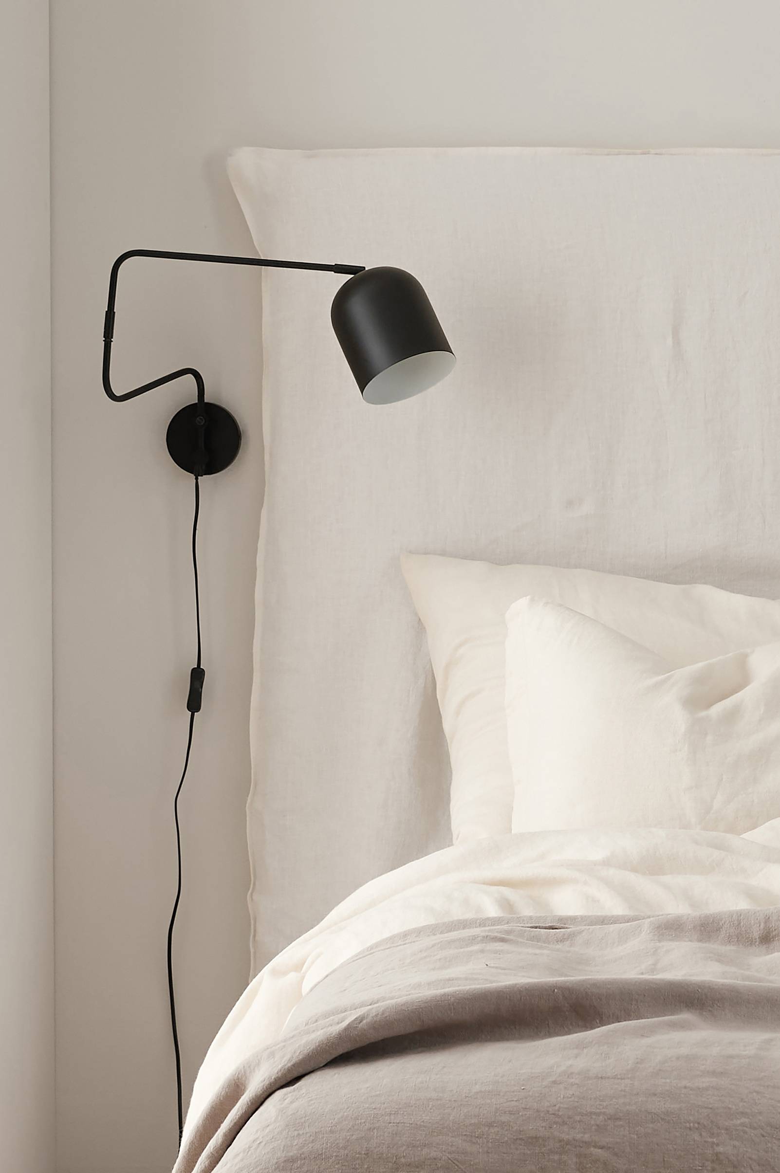 Vägglampa i metall med en vridbar arm som går ut från väggen och skärm som kan justeras i höjd och sidled.
