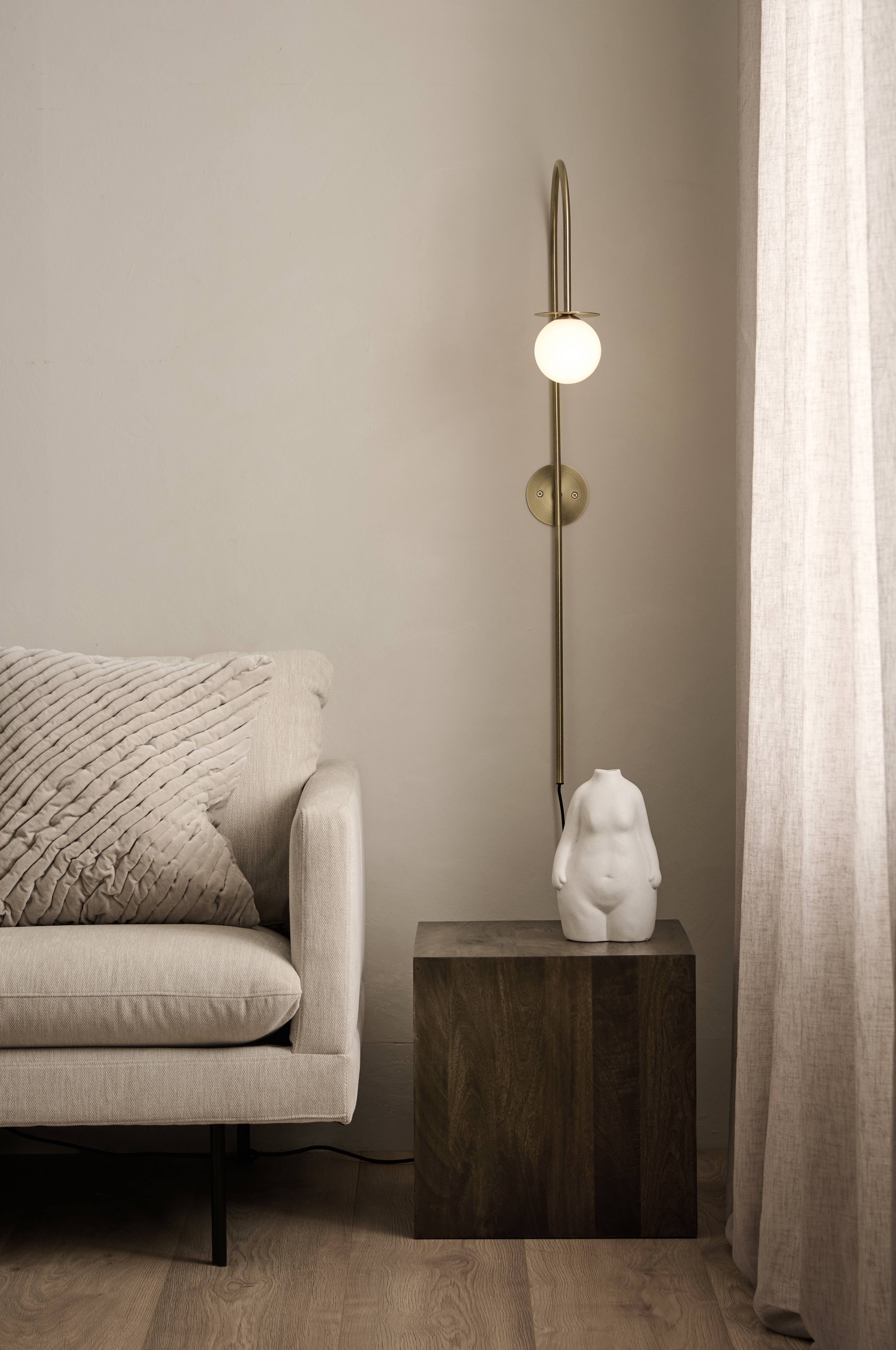 Vägglampa i metall med kupa i opalvitt glas. Kupan fästs och lossas genom skruvfunktion. Väggplattans diameter 10 cm, glaskupans diameter 9 cm. Textilsladd med strömbrytare och väggkontakt.