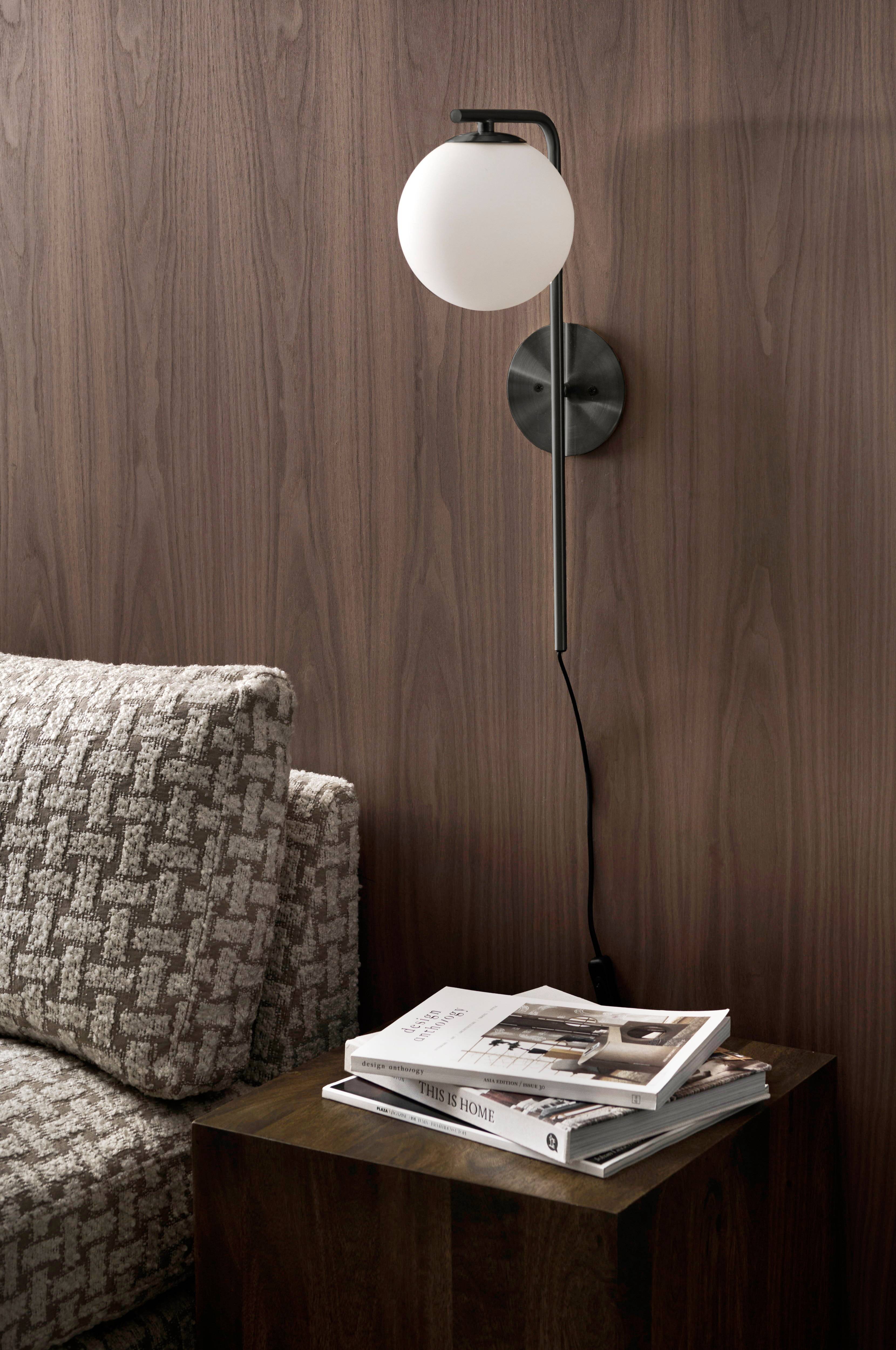 Vägglampa i mässingsfärgad metall eller pulverlackad svart metall med kupa i opalvitt glas. Kupan fästs och lossas genom skruvfunktion. Väggplattans diameter 12 cm, glaskupans diameter 15 cm. Svart plastsladd med strömbrytare och svart väggkontakt. Ljuskälla ingår ej.