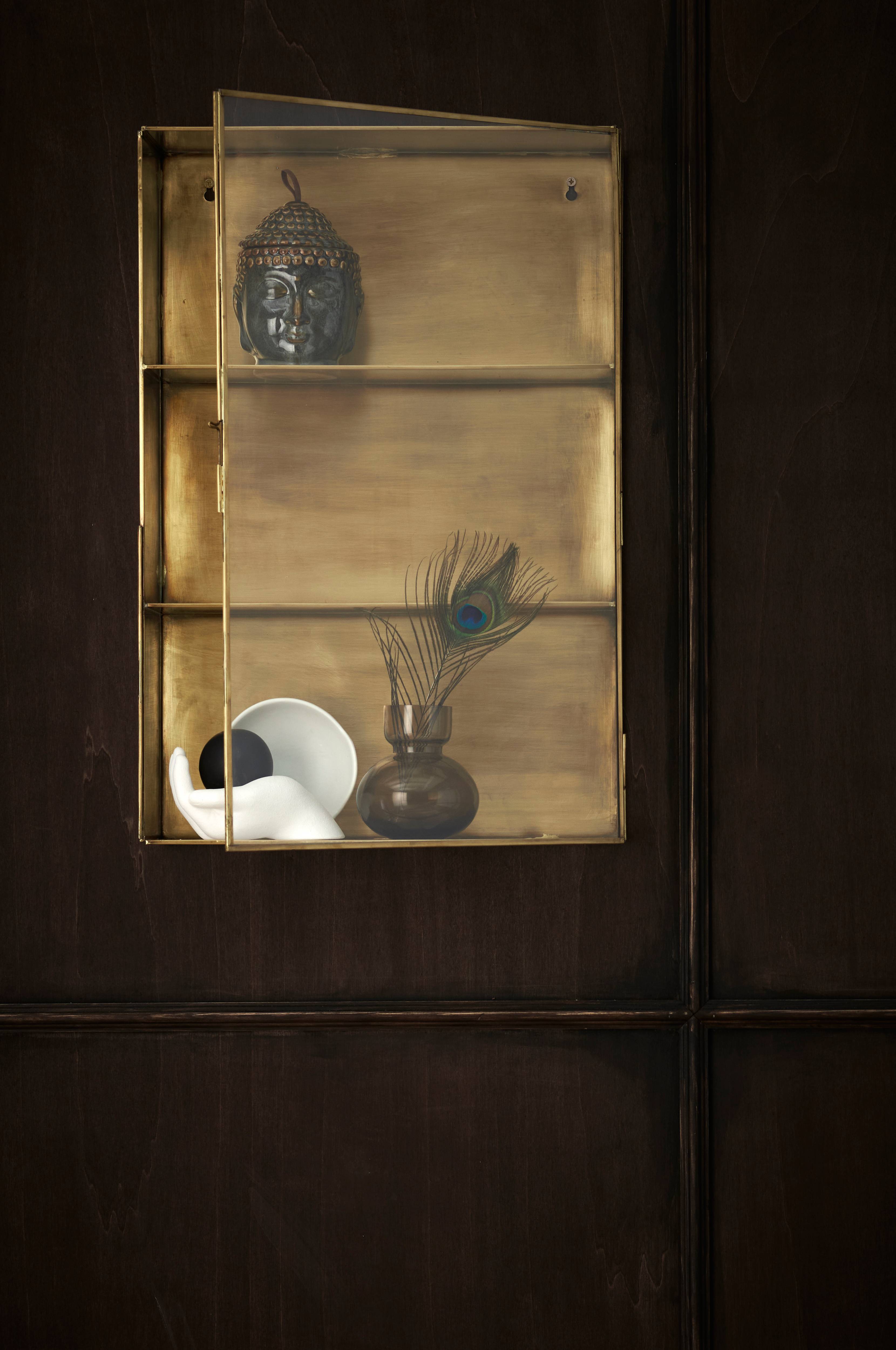 Lätt, slimmat väggskåp i antikmässingfärgad, tunn metall med härdat glas. Baksida i metall. Glasdörr med som stängs med hasp. Tre fasta hyllplan i glas med dekorkant i metall. Mått: Bredd 40,5 cm, höjd 60 cm, djup 15,5 cm Höjd mellan hyllplanen 19 cm. Monterat.