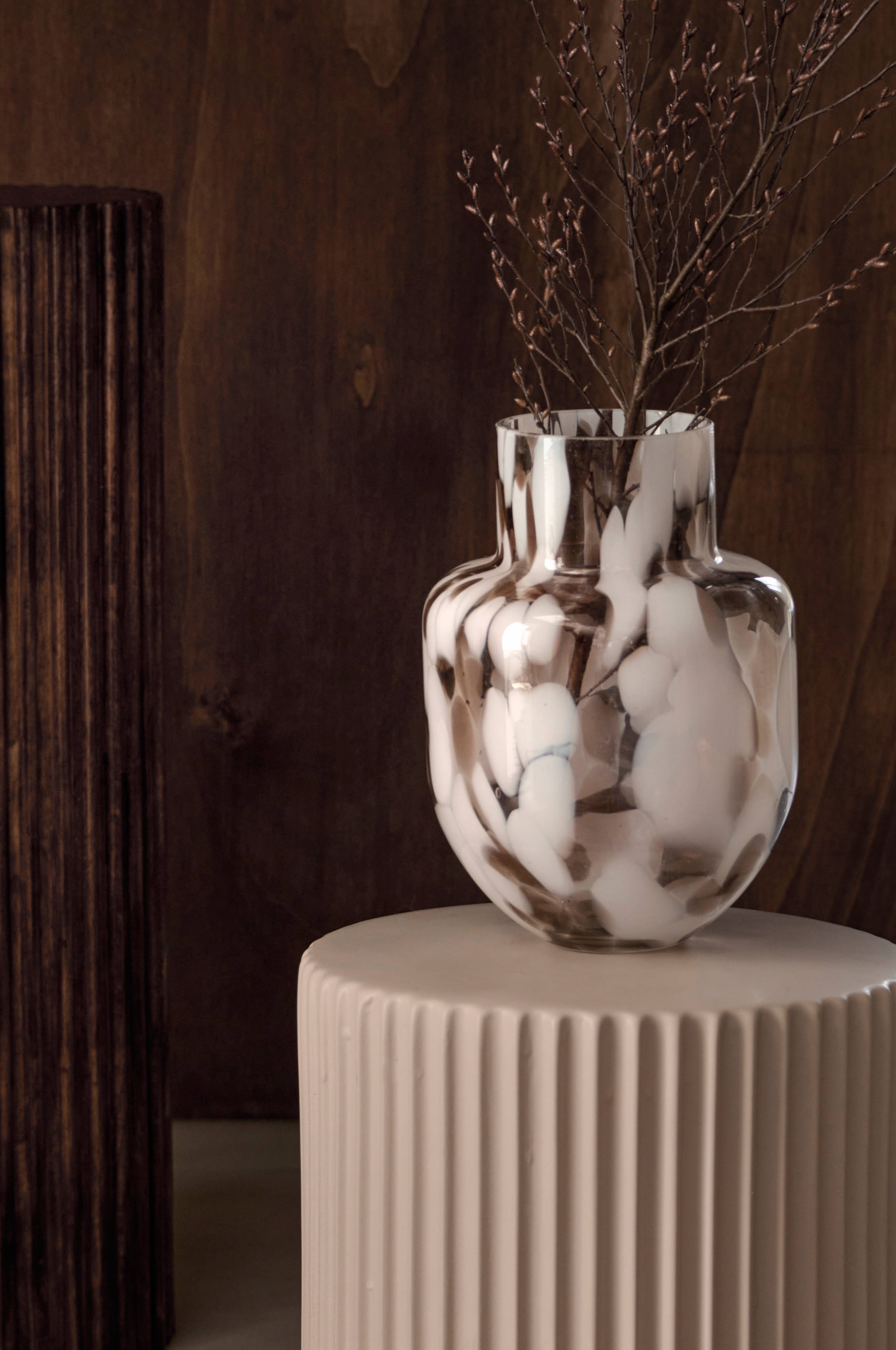 Handtillverkad vas av mönstrat glas. Diameter som störst 18 cm, diameter öppningen 10 cm.