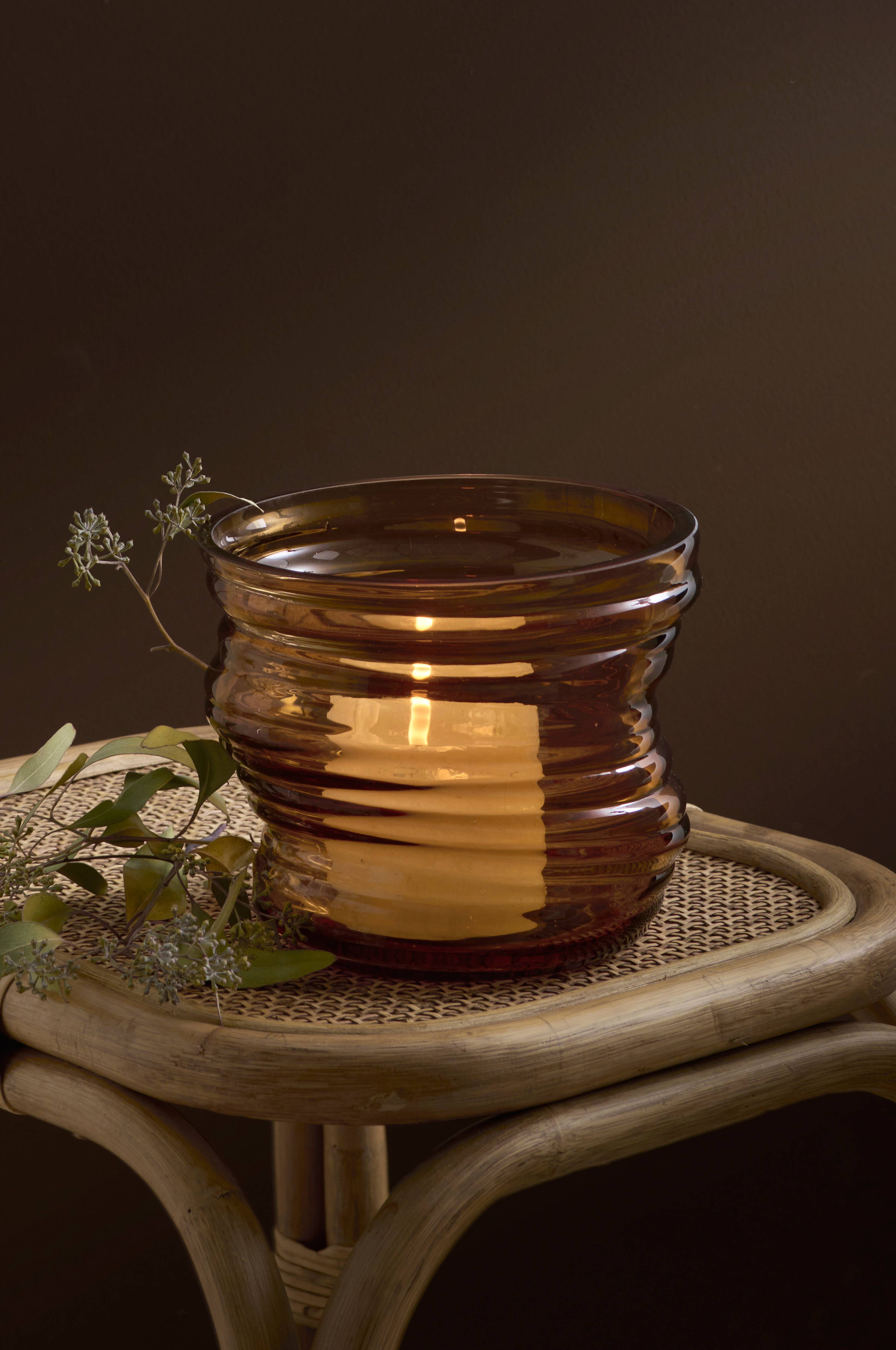 Vas / ljuslykta av glas med mjuka, organiska former. Diameter nedtill ca 13 cm, diameter upptill ca 16 cm.