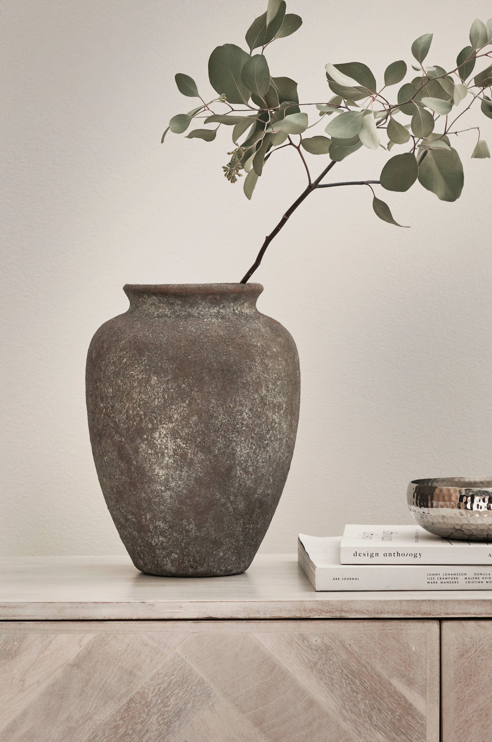 Vas / urna i keramik med strukturerad yta. Diameter som störst ca 18 cm. Innerdiameter toppen ca 10 cm.