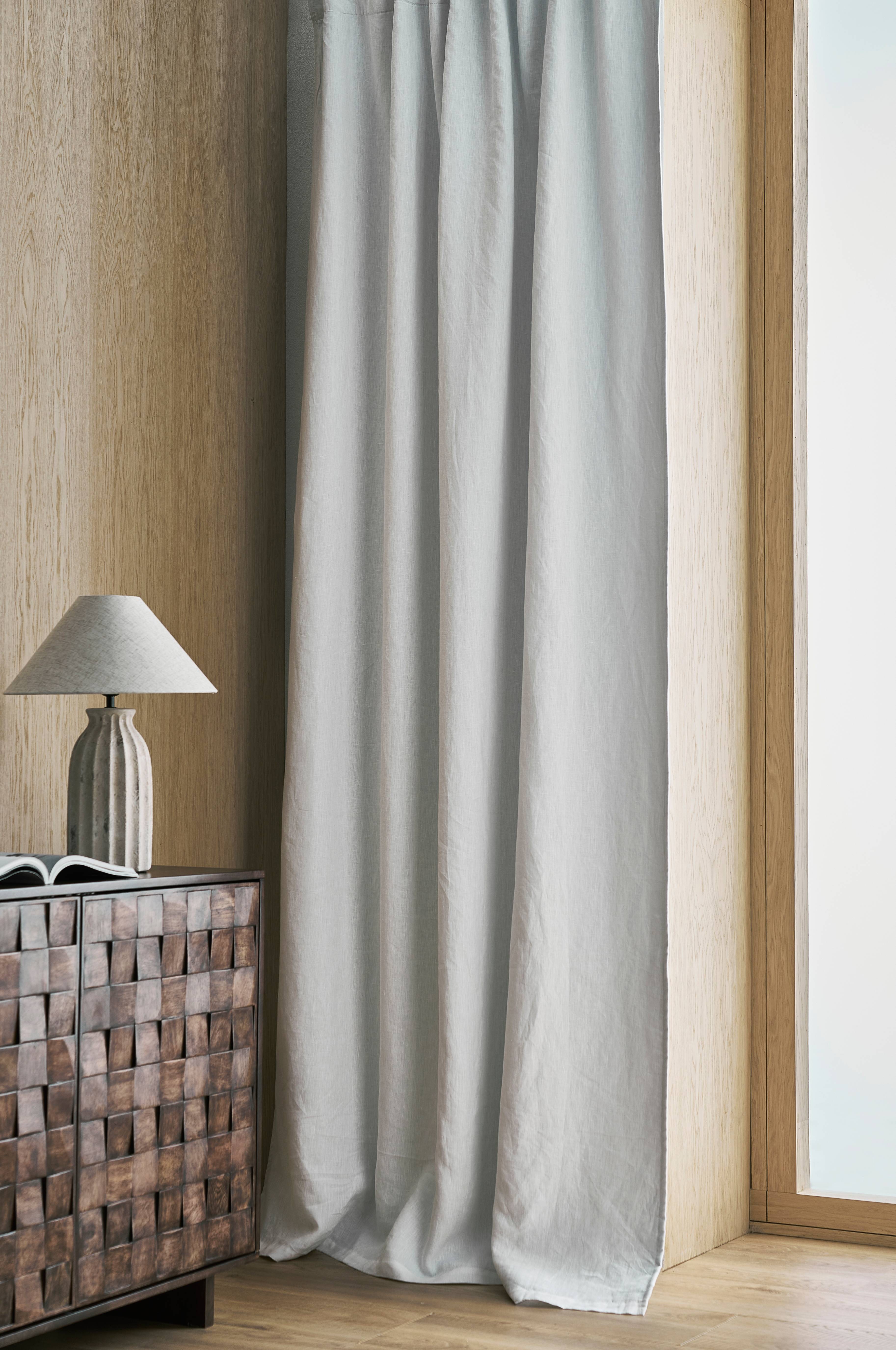 Veckbandslängd i tvättad linnekvalitet. Ett vävt mellanlager/foder i polyester med invävda svarta trådar gör att gardinen skärmarav ljuset. Med multiband som gör att du antingen kan trä gardinerna direkt på en gardinstång eller använda ringar och nålkrokar eller fingerkrokar. Snören i rynkbandet gör att du lätt kan skapa jämna, fina veck. Matchande färg ton-i-ton på baksidan.