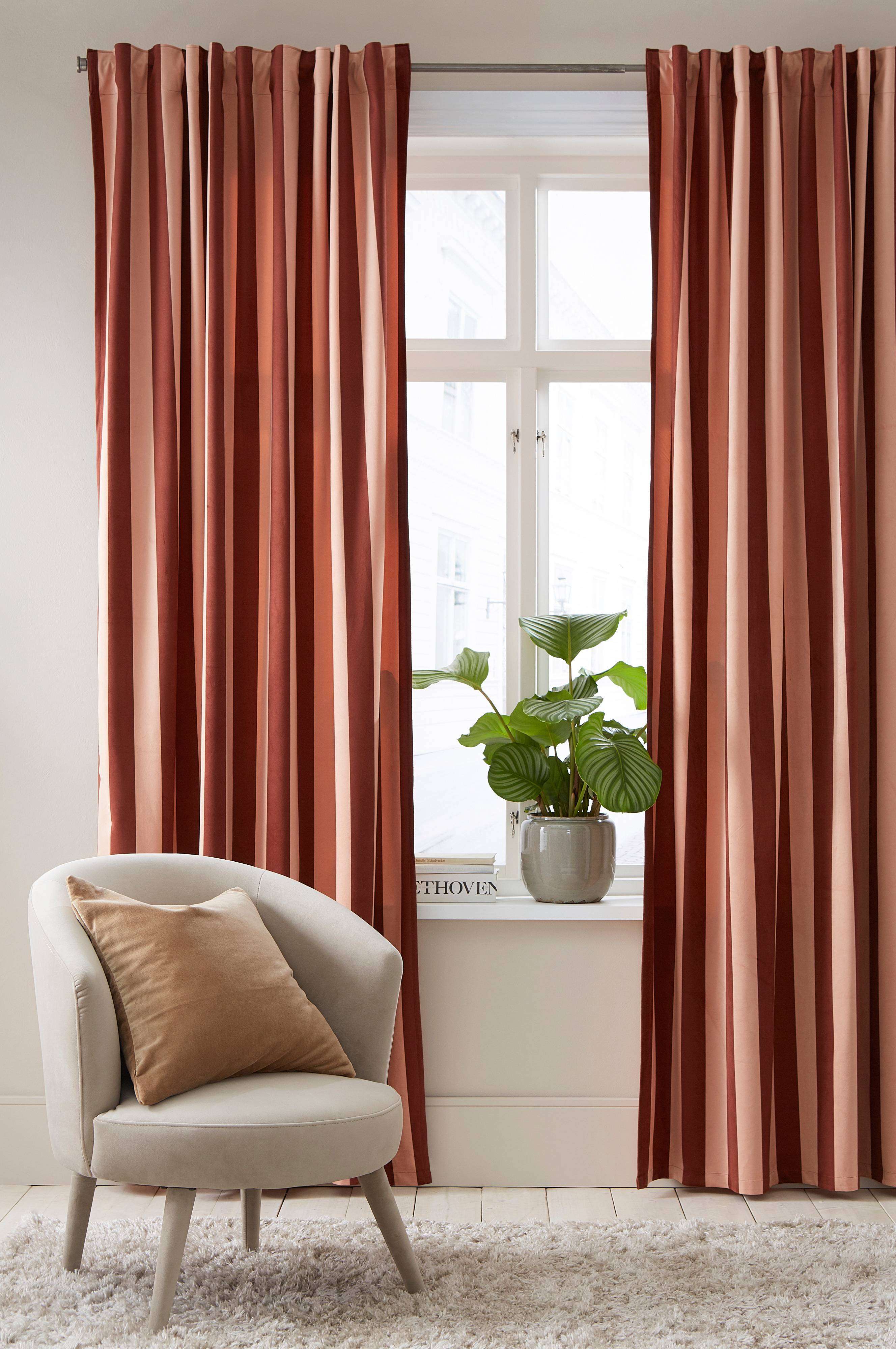 Två veckbandslängder av sammet med tryckta blockränder. Med multiband som gör att du antingen kan hänga gardinerna direkt på en gardinstång genom de gömda hällorna eller använda ringar och nålkrokar (ej fingerkrokar). Snören i rynkbandet gör att du lätt kan skapa jämna, fina veck. Bredd 140 cm. Tre längder: 220, 250 och 300 cm.