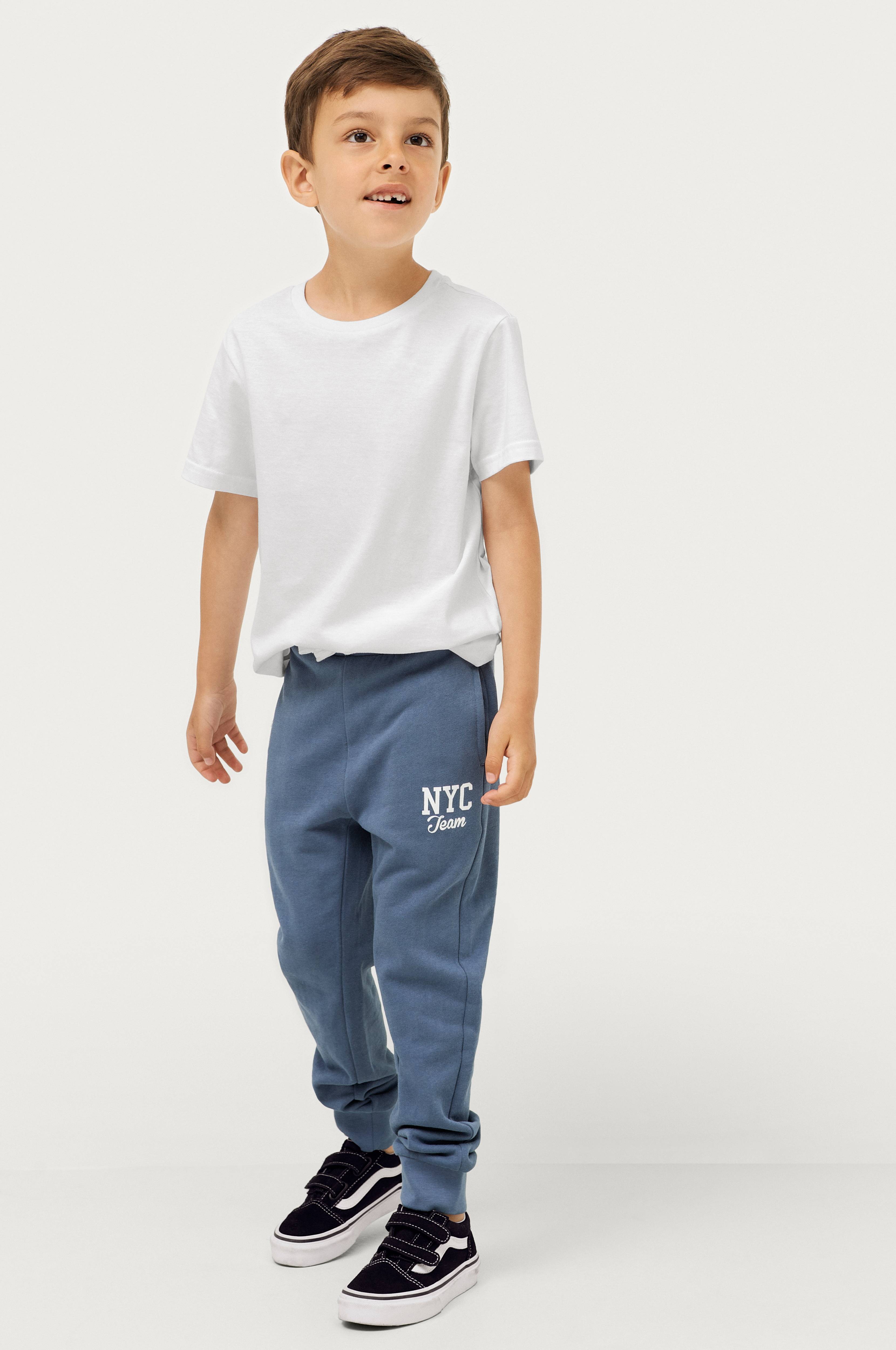 Sköna joggingbyxor med mjuk, borstad insida och tryck vid höften. Fickor i sidorna och mudd i bensluten. Elastisk midja med dragsko.