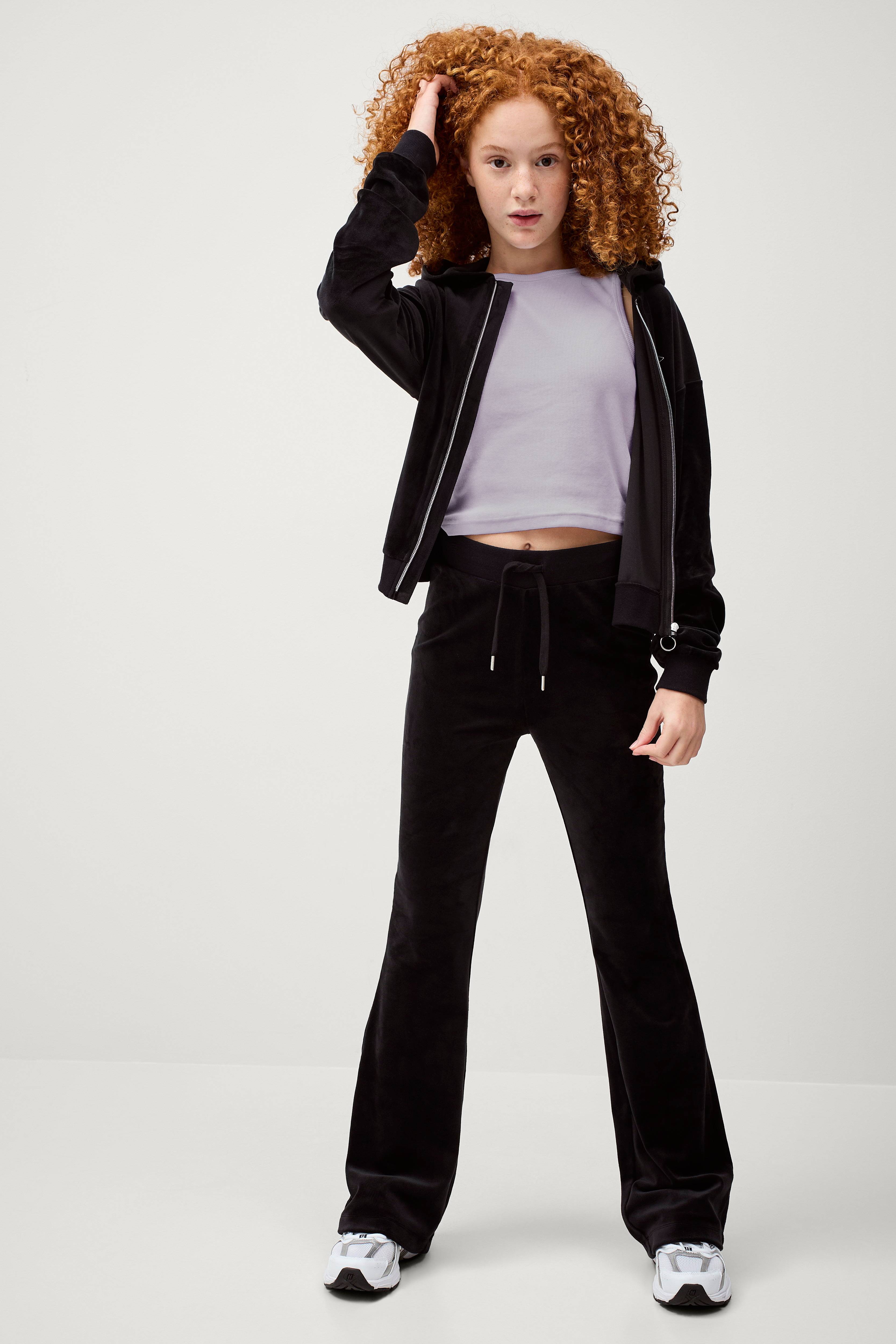 • Jacka med huva• Dragkedja fram• Litet, glittrigt tryck på bröstet• Ribbmudd i ärmsluten och i nederkanten• Byxor med utsvängda ben• Hög midja med resårlinning och dragsko
