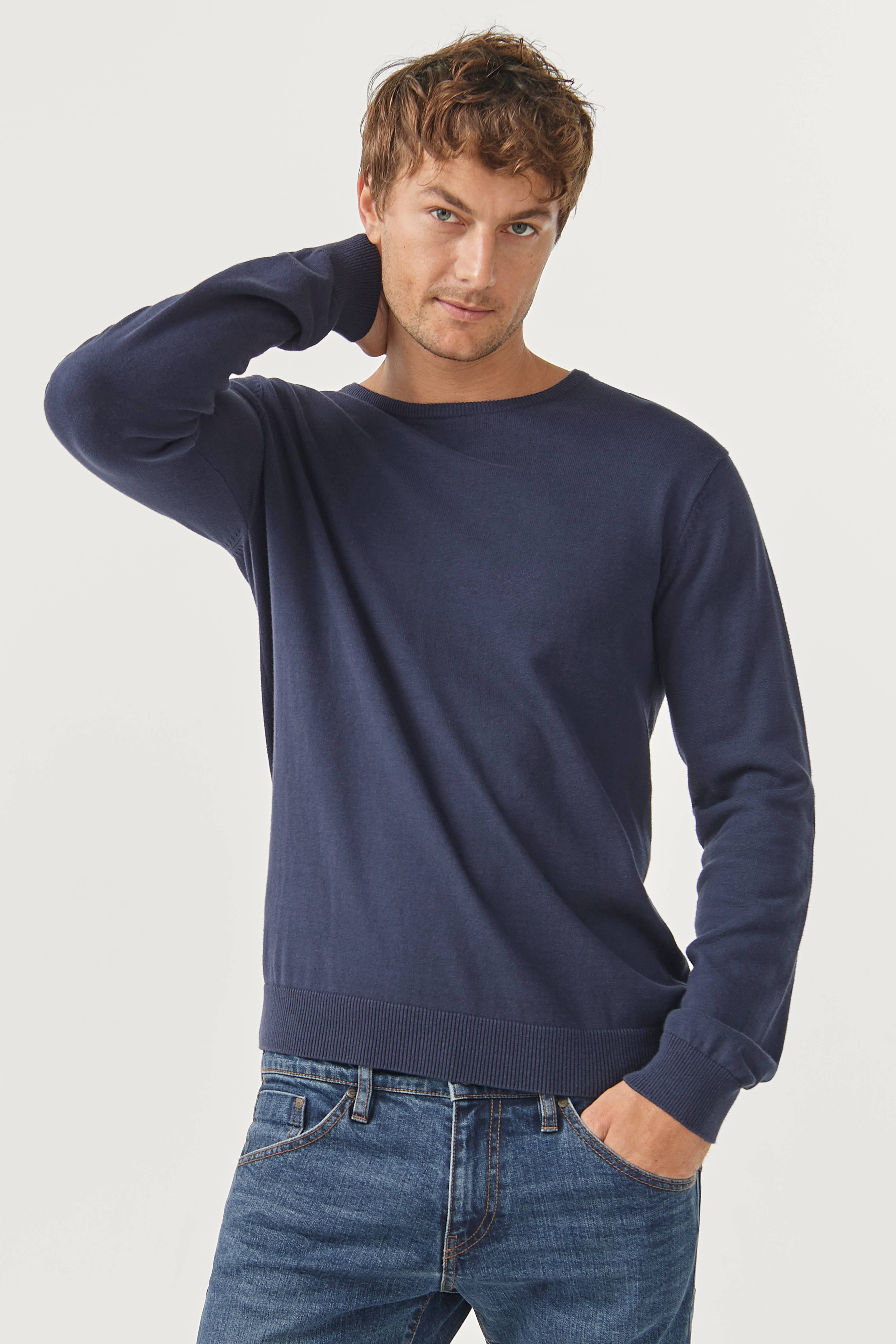Finstickad tröja i skön kvalitet av bomull. Rund halsringning med finribbad kant. Ribbade muddar i ärmslut och nedtill. Längd ca 71 cm i stl M.