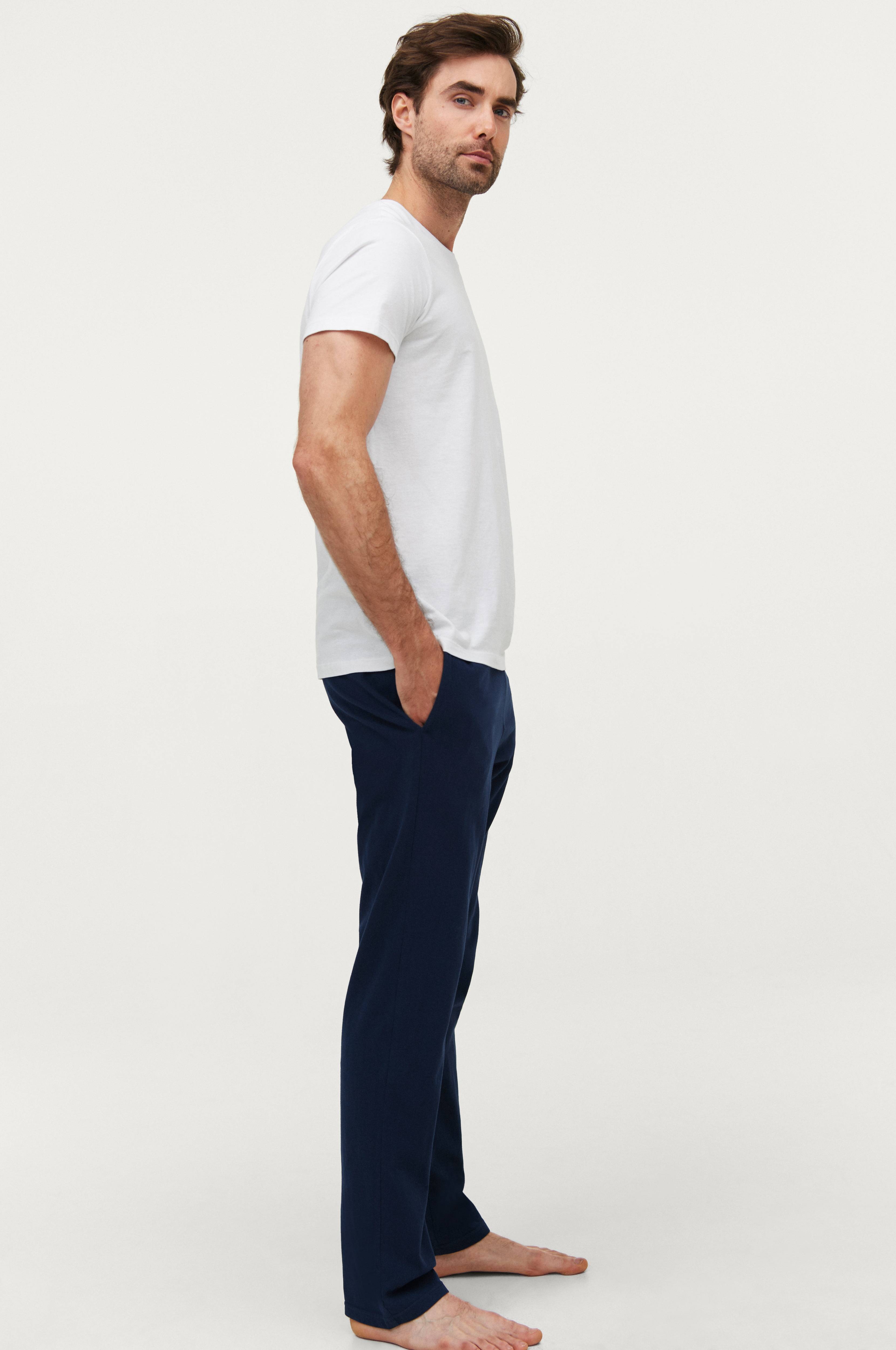 Byxor i mjuk trikå av bomull och viskos. Ett avslappnat, mjukt mysplagg att koppla av i hemma, med resårlinning och fickor i sidorna.