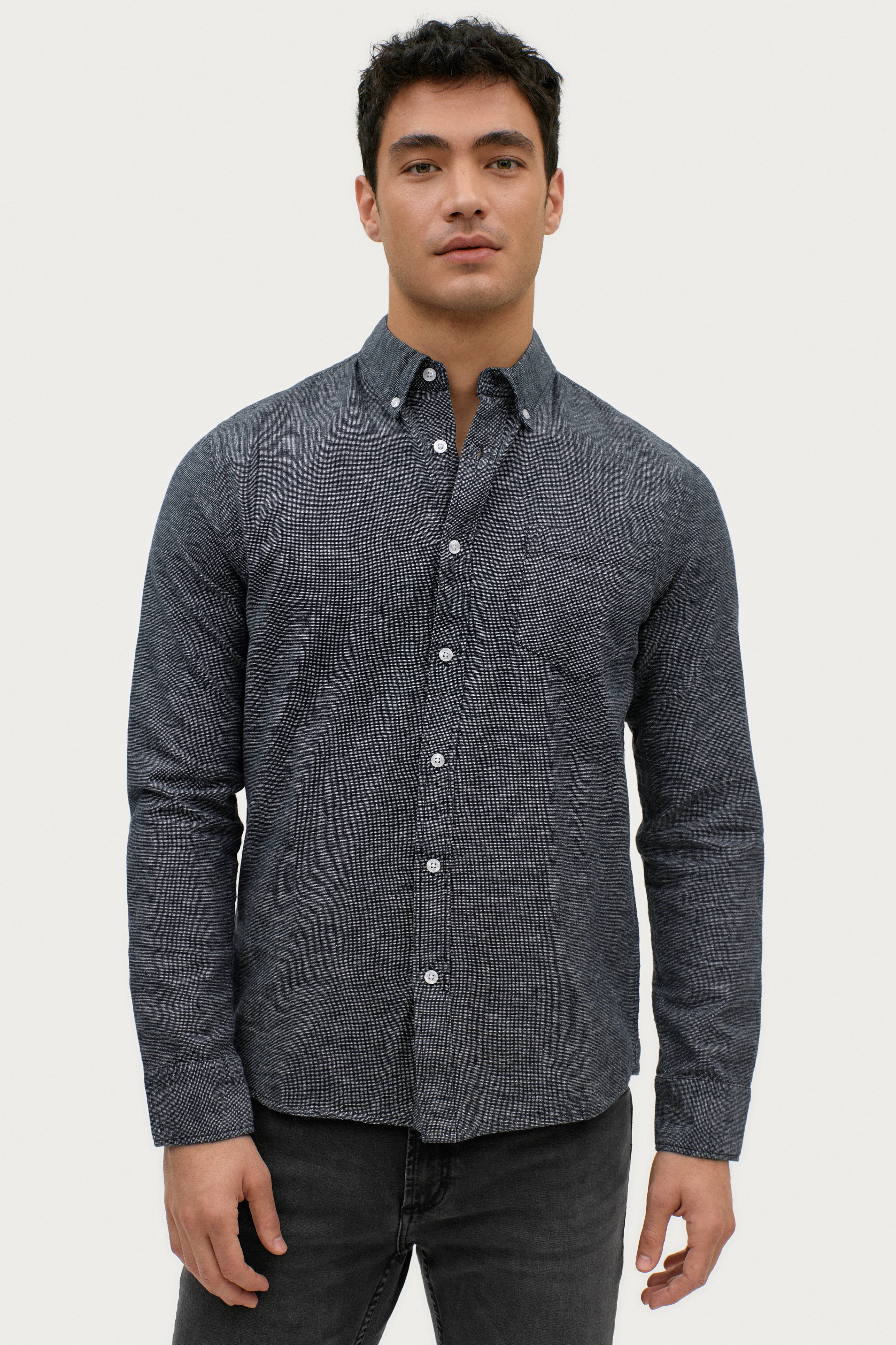 Långärmad skjorta i melerad bomulls- och linnemix. Knappar fram och en bröstficka. Längd ca 71 cm i stl M.