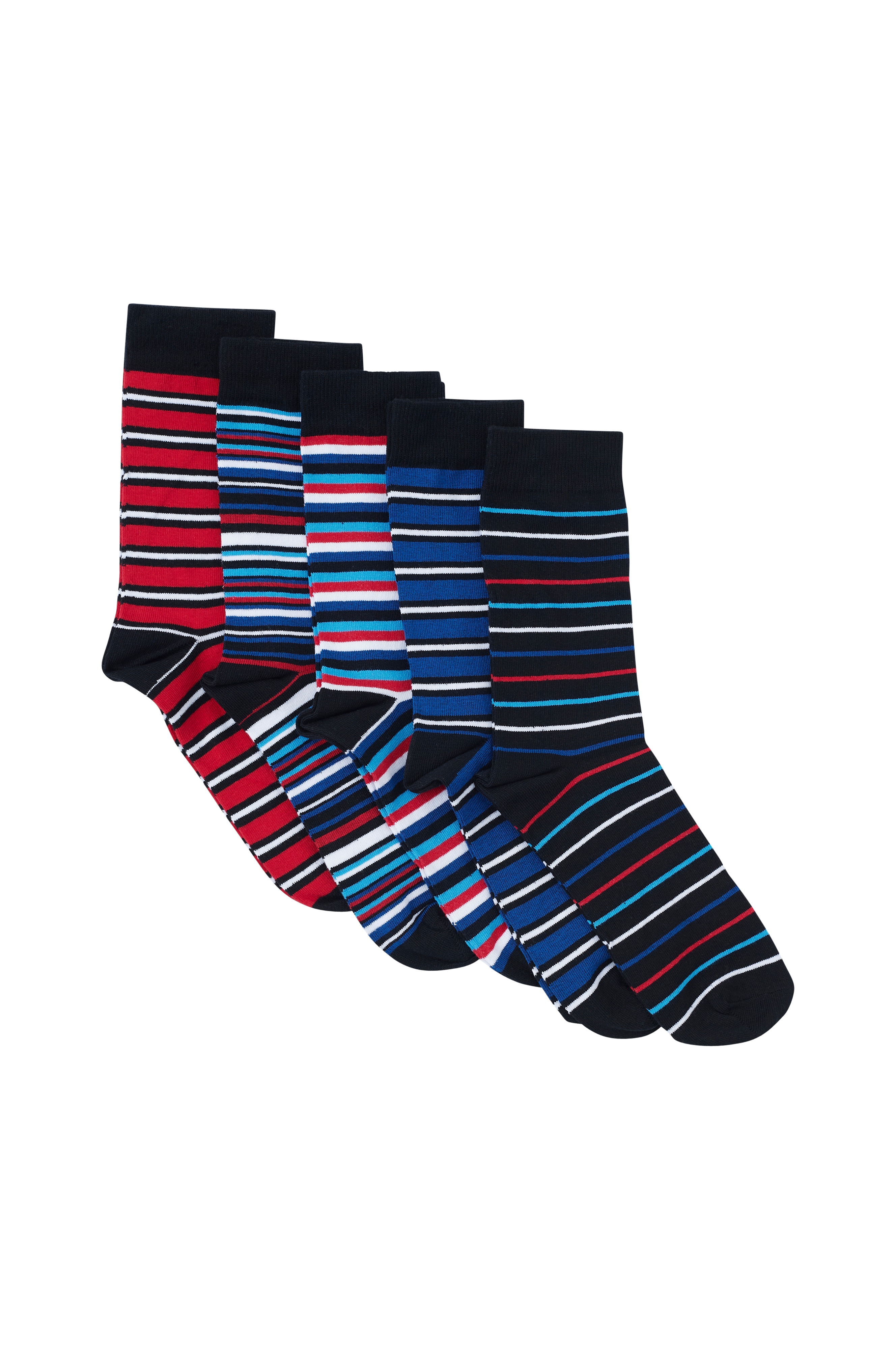 Sockar i 5-pack med stickade ränder i olika färgkombinationer.
