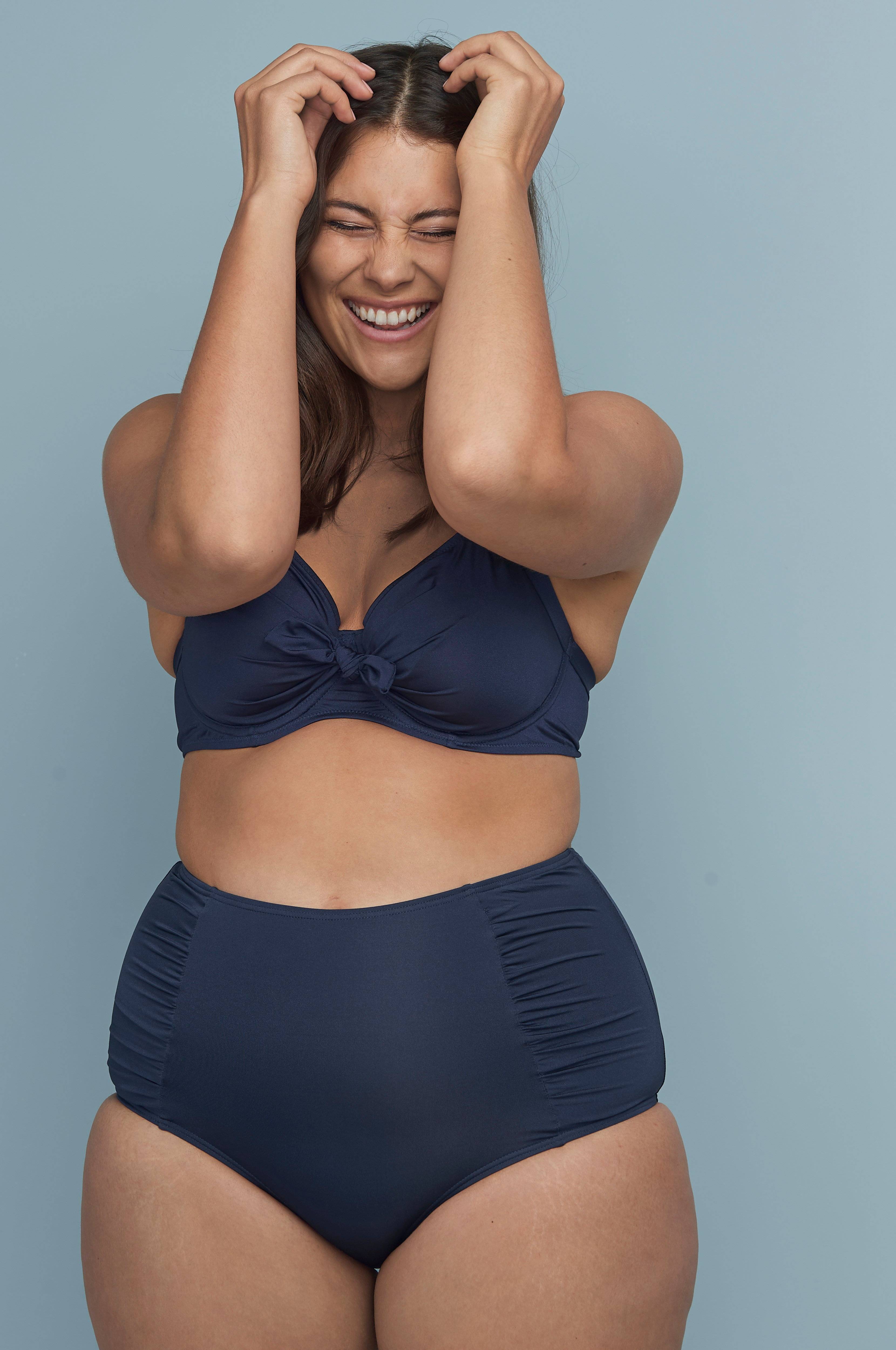 Hög bikinitrosa i maximodell med breda sidor med rynkad drapering. Helfodrad.