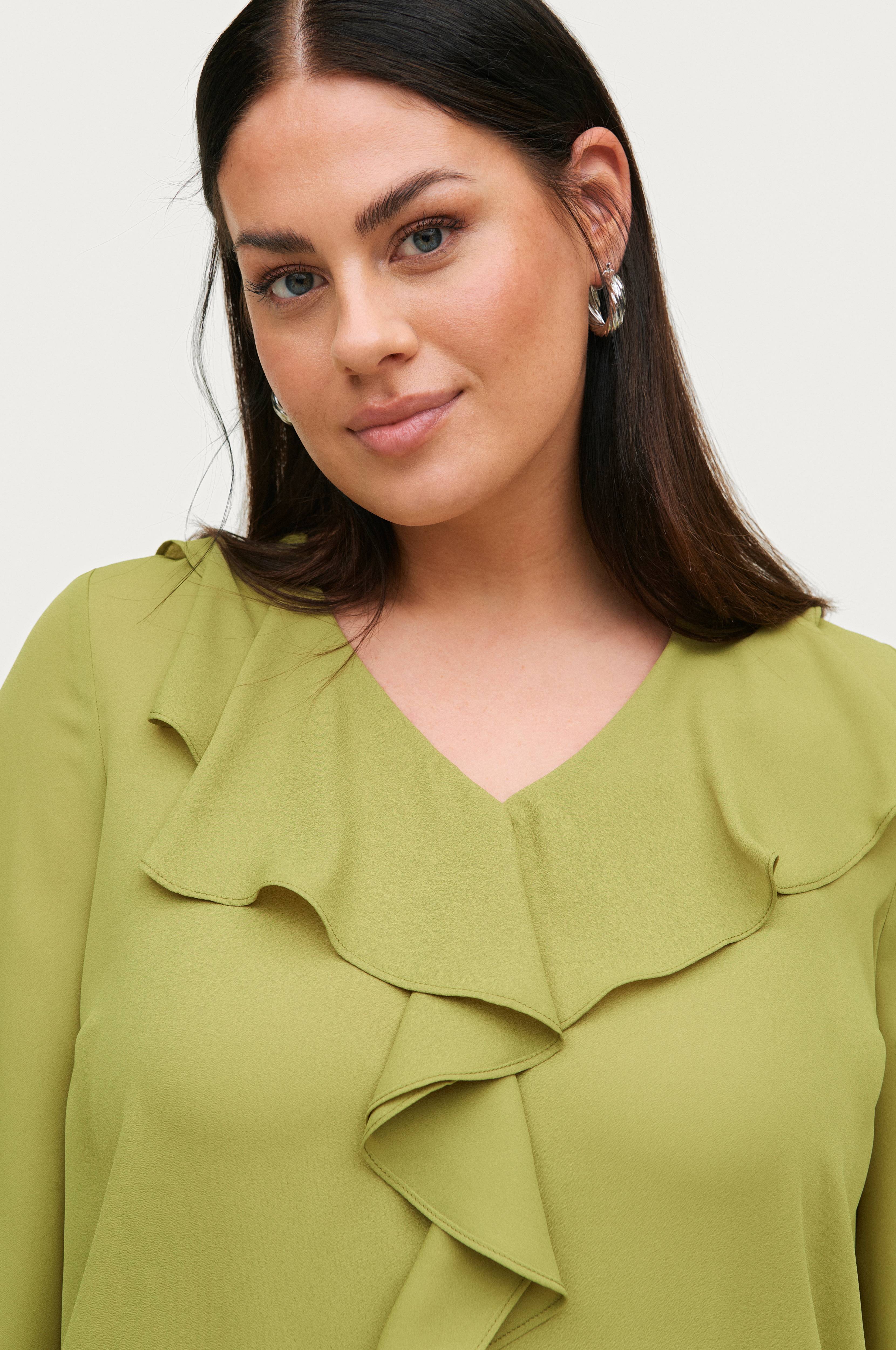 Blus med v-ringning med volang fram. Långa ballongärmar med knapp i ärmsluten. Gjord i tunn, vävd kvalitet som är något transparent. Längd ca 76 cm i stl 42/44.