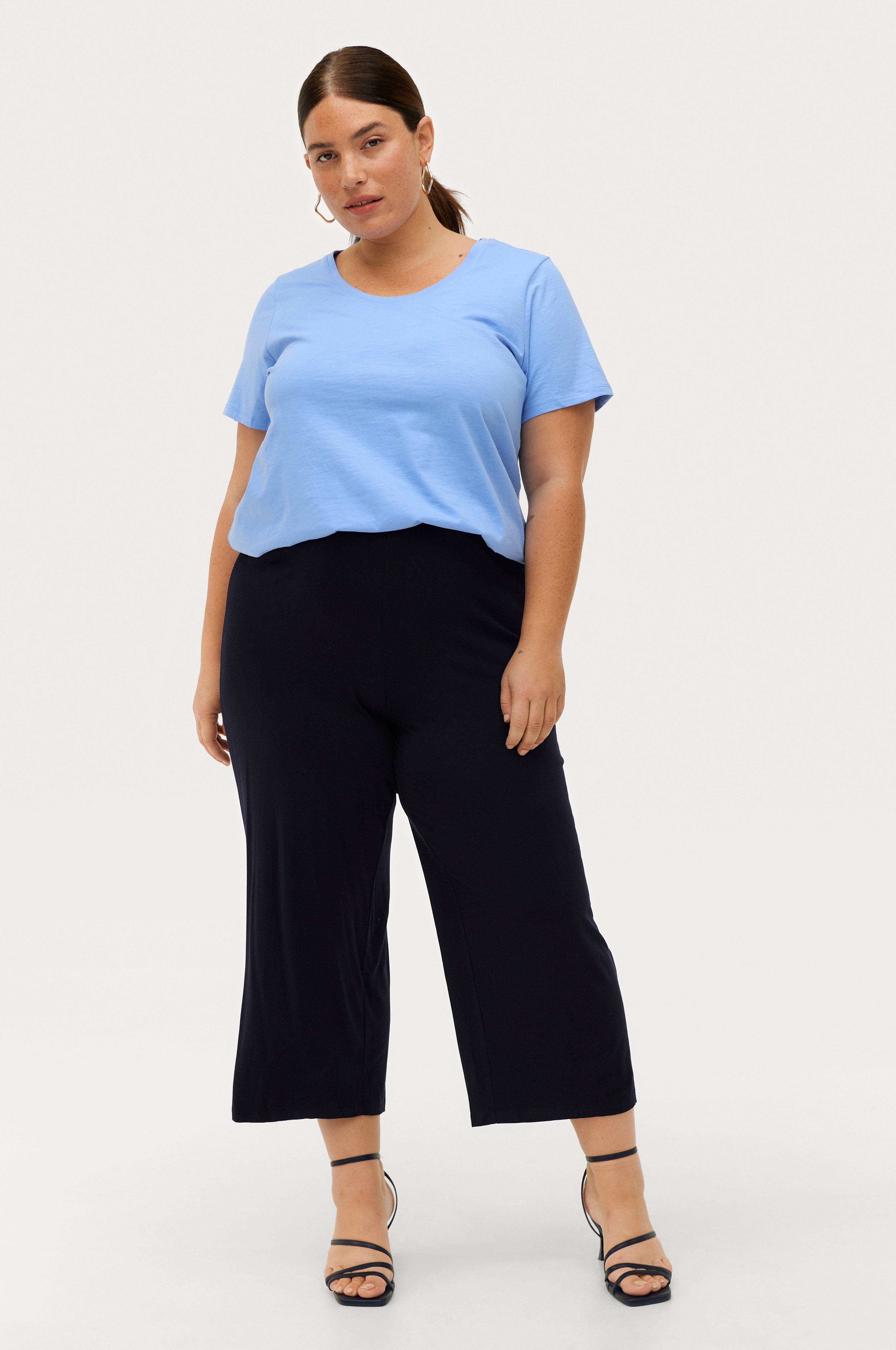 Modell i följsam trikå med vida, raka ben och hög midja med infälld resår. Beninnerlängd ca 63 cm i stl 42/44.