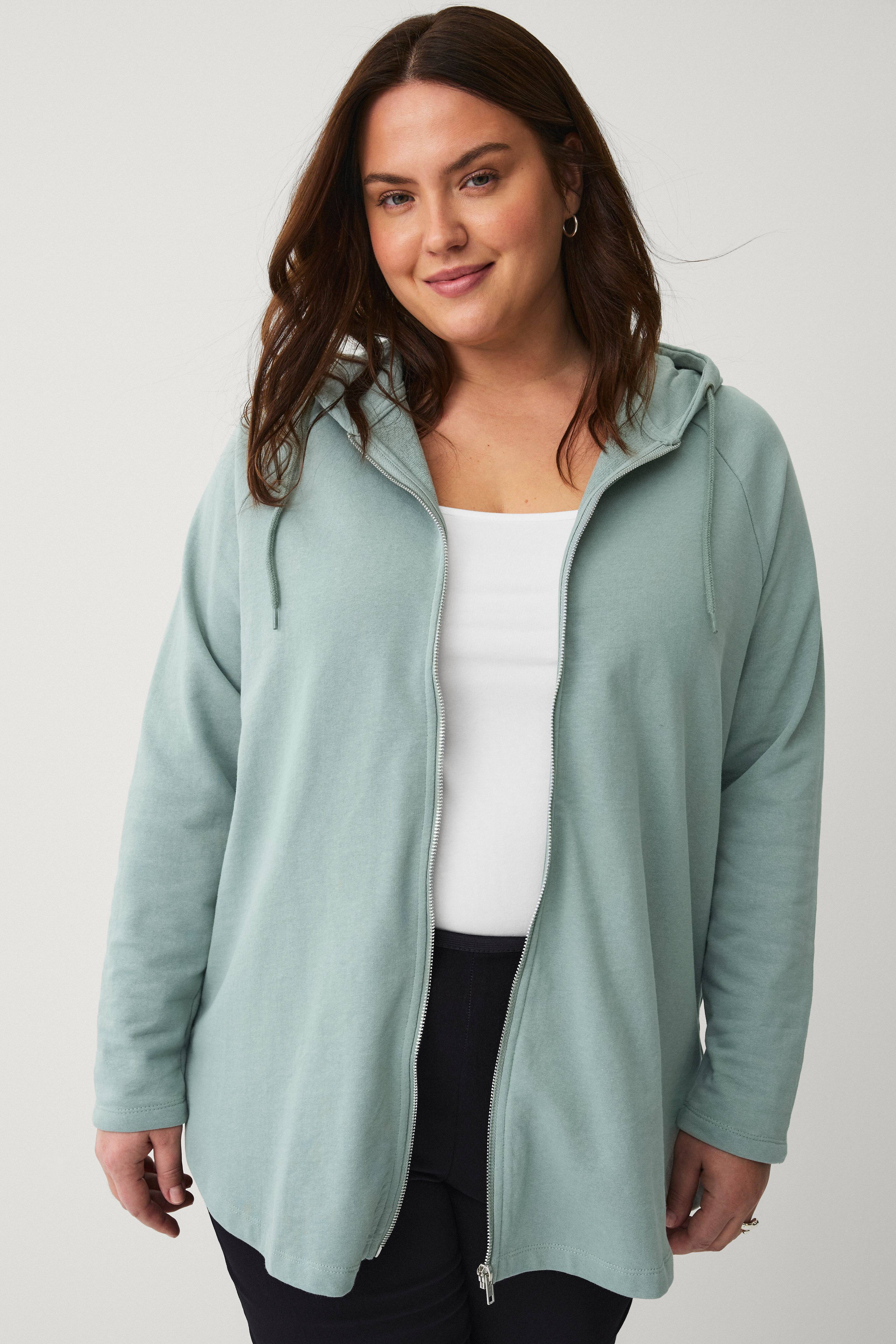 • Huvtröja med dragkedja fram • Rundad nederkant • Fodrad huva med dragsko • Nerhasad axel • Plusstorlek • Plagget är något längre bak än fram än bak • Längd: 86 cm i storlek 46/48