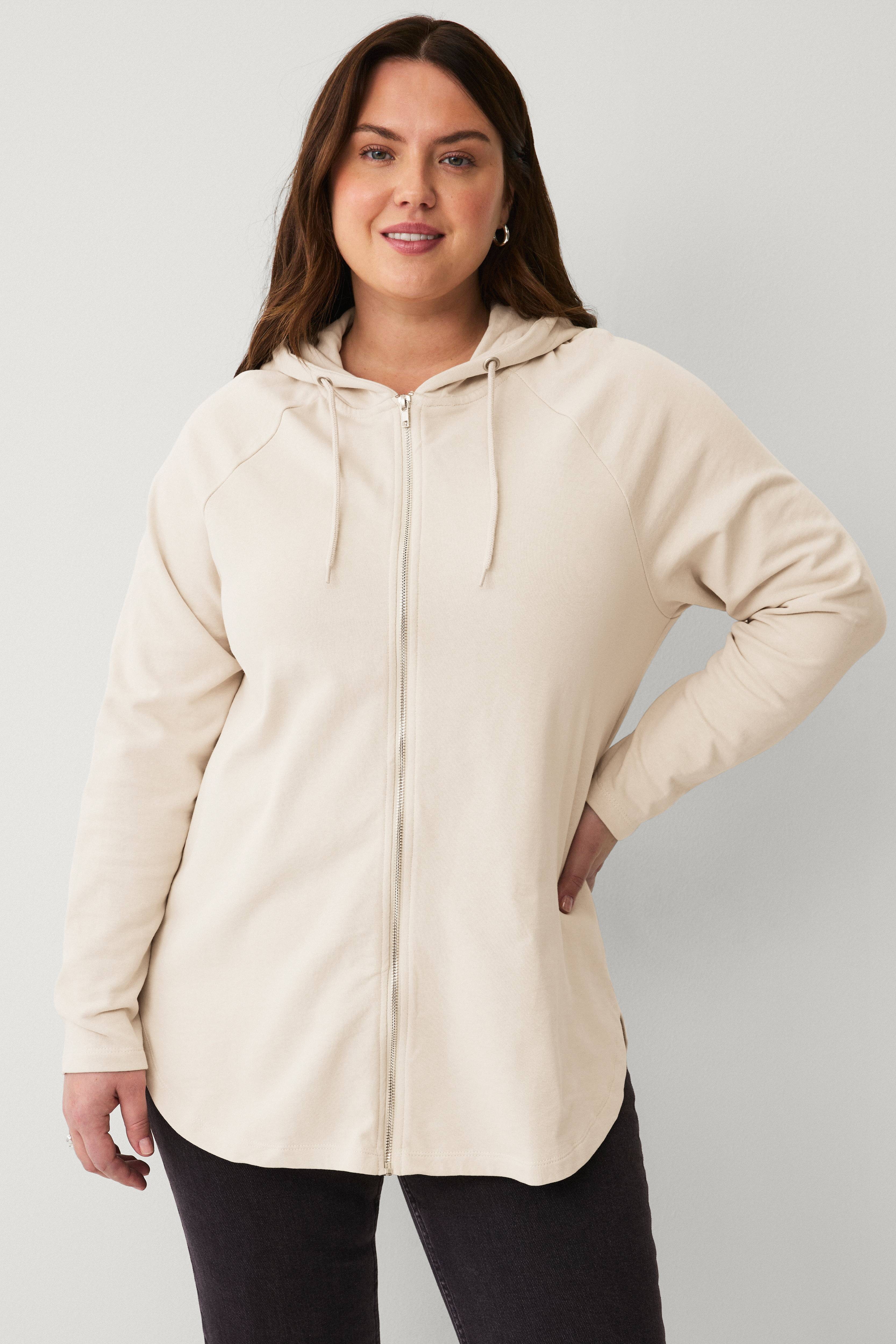 • Huvtröja med dragkedja fram • Rundad nederkant • Fodrad huva med dragsko • Nerhasad axel • Plusstorlek • Plagget är något längre bak än fram än bak • Längd: 86 cm i storlek 46/48