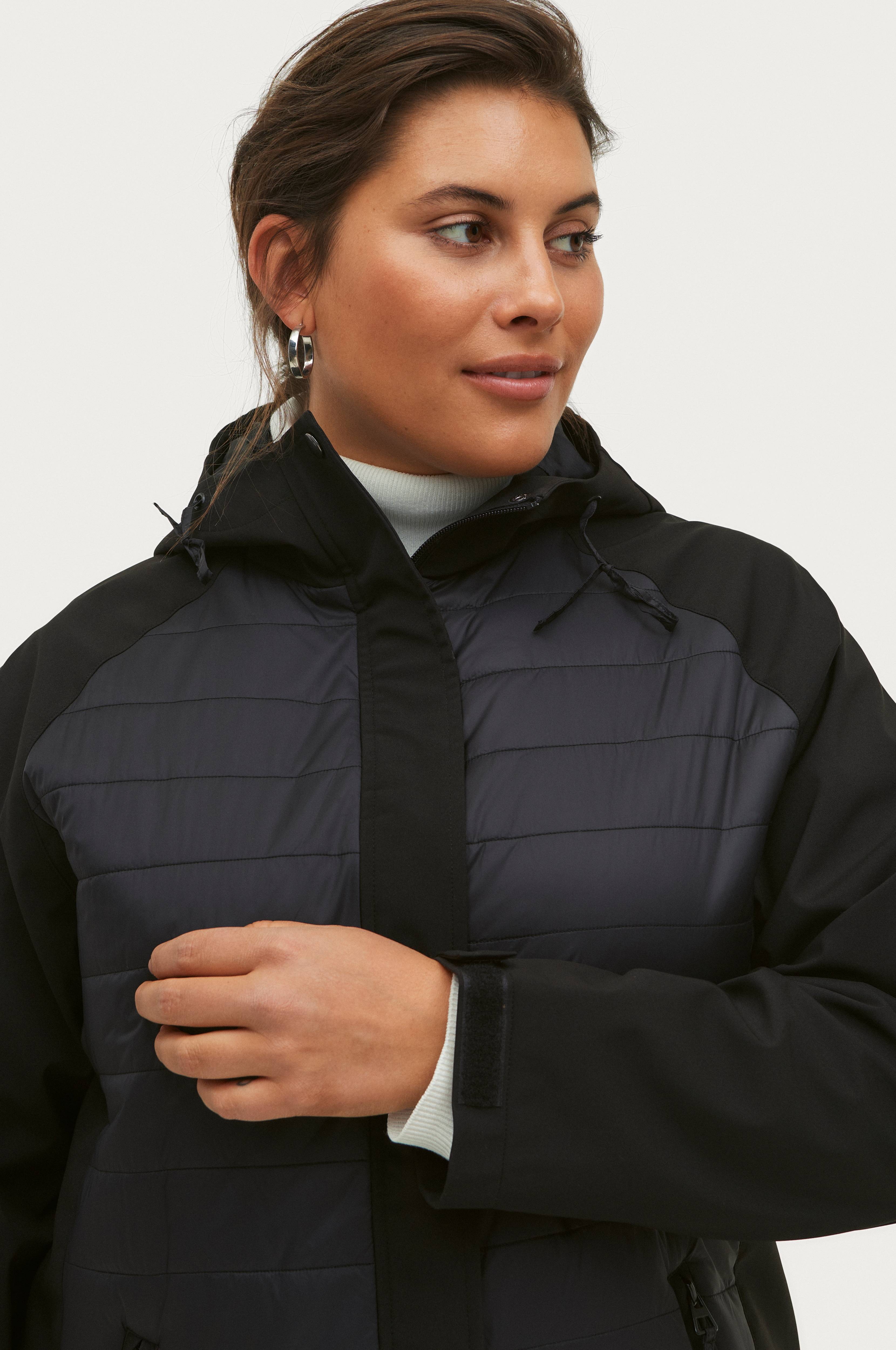 Ellos Plus Collection genomsyras av kvalitet och hållbarhet. Plaggen är designade för kvinnor i storlek 44–60 med fokus på passform och komfort. • Tunn vaddering fram och bak • Ärmar i softshell • Sidopaneler i softshell • Fast huva med dragsko • Tvåvägsdragkedja fram • Fickor med dragkedja • Kardborreslejf i ärmsluten • Längd: 84 cm i storlek 46/48