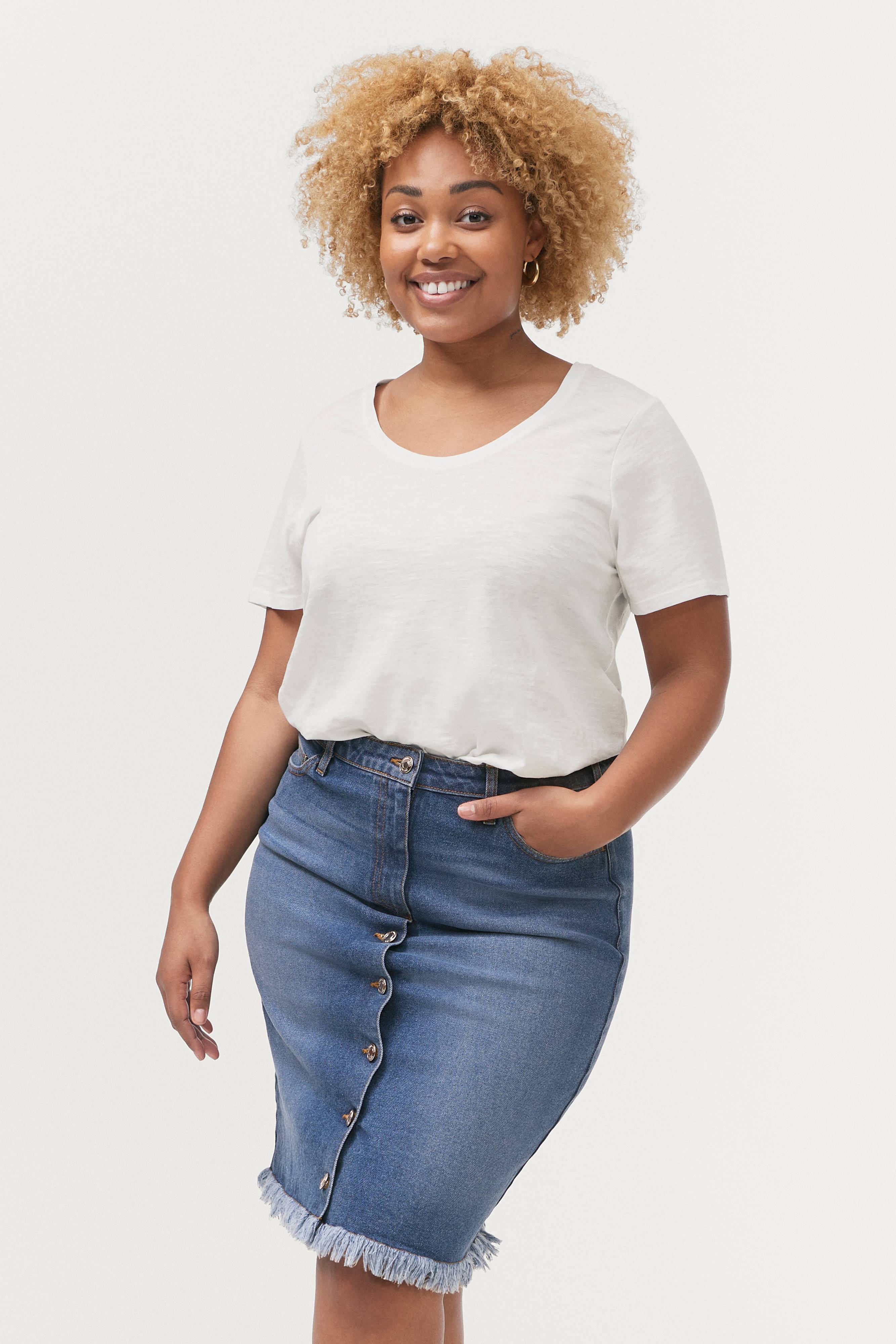Jeanskjol i stretchdenim med smal passform. Knappar fram, linning med hällor och gylf med dragkedja. Tre fickor fram och fransig nederkant. Sprund nedtill bak. Längd ca 58 cm i stl 44.