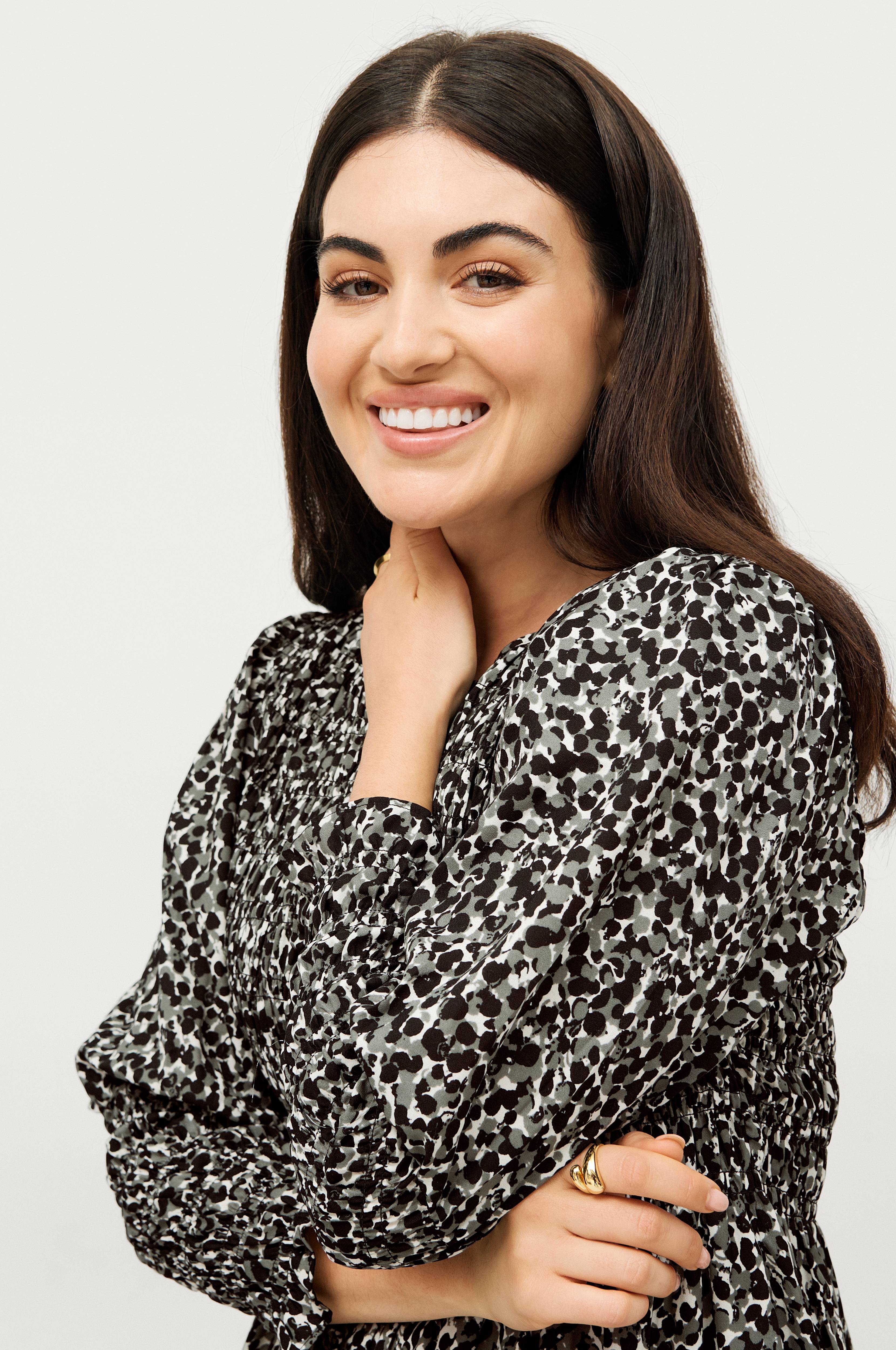 • Midiklänning• Smock upptill• Rund hals med sprund och knapp bak• Långa puffärmar med lång, smockad mudd• Längd: 110 cm i storlek 46/48