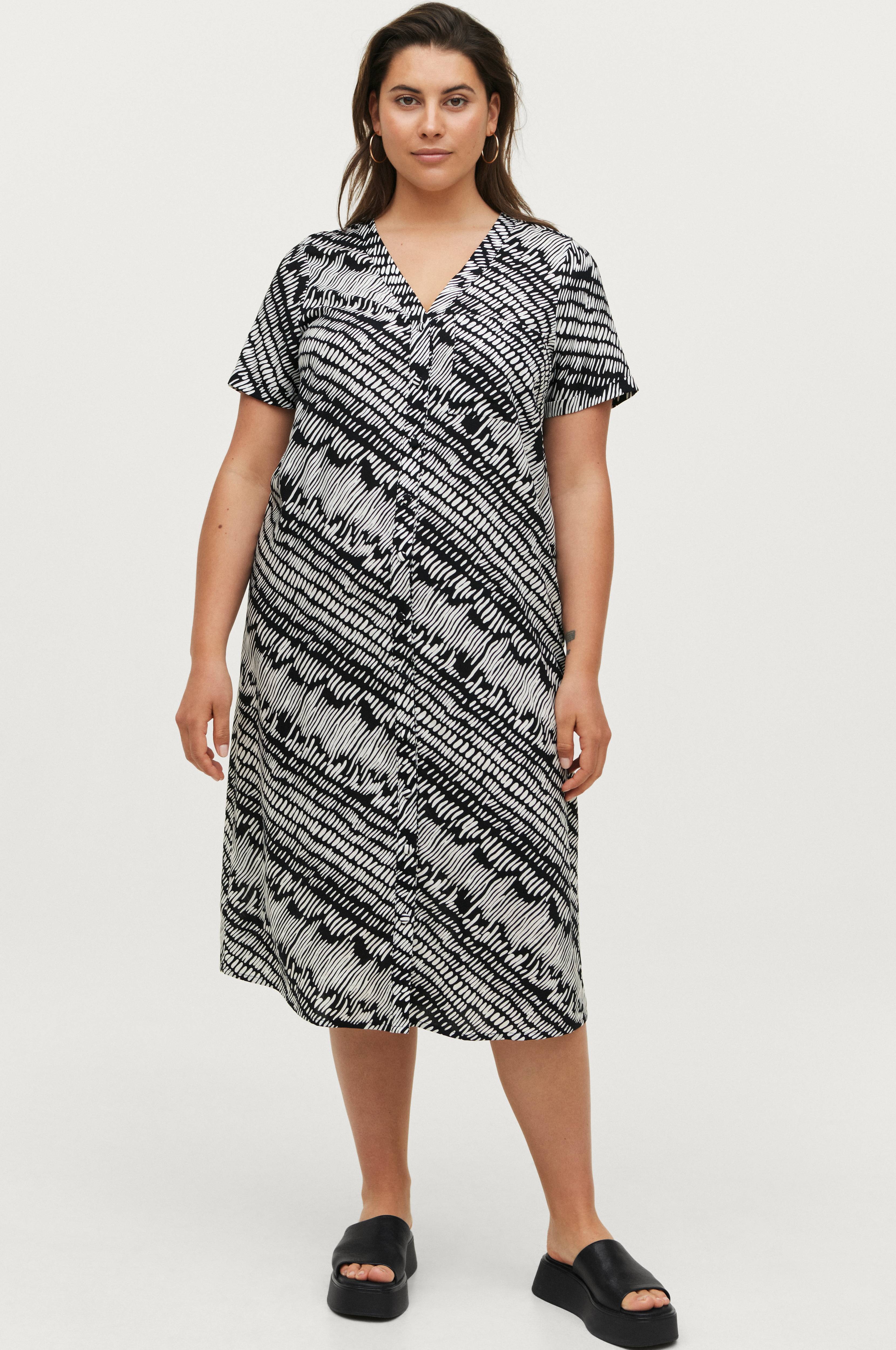 Fin, smickrande sommarklänning för oss med full figur. Rak, elegant och enkel skärning, feminin. Mjukt tyg och fina tygknappar längs med hela framsidan.