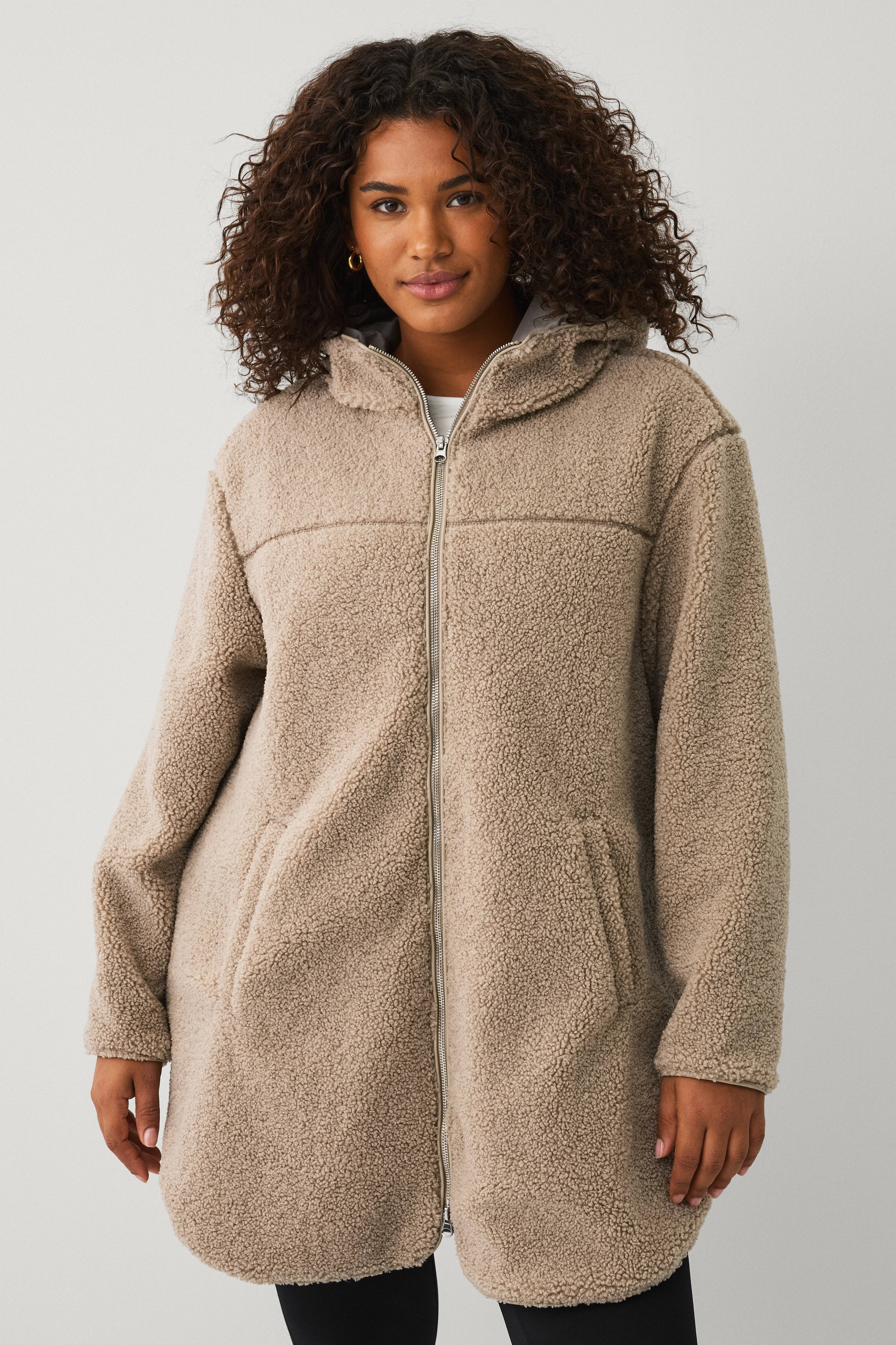 • Lång jacka i pile med vävt innerfoder • Hög hals med huva • Dragkedja fram • Sidfickor med invändig fleece • Rundad nederkant • Plusstorlekar • Längd: 94 cm i storlek XL
