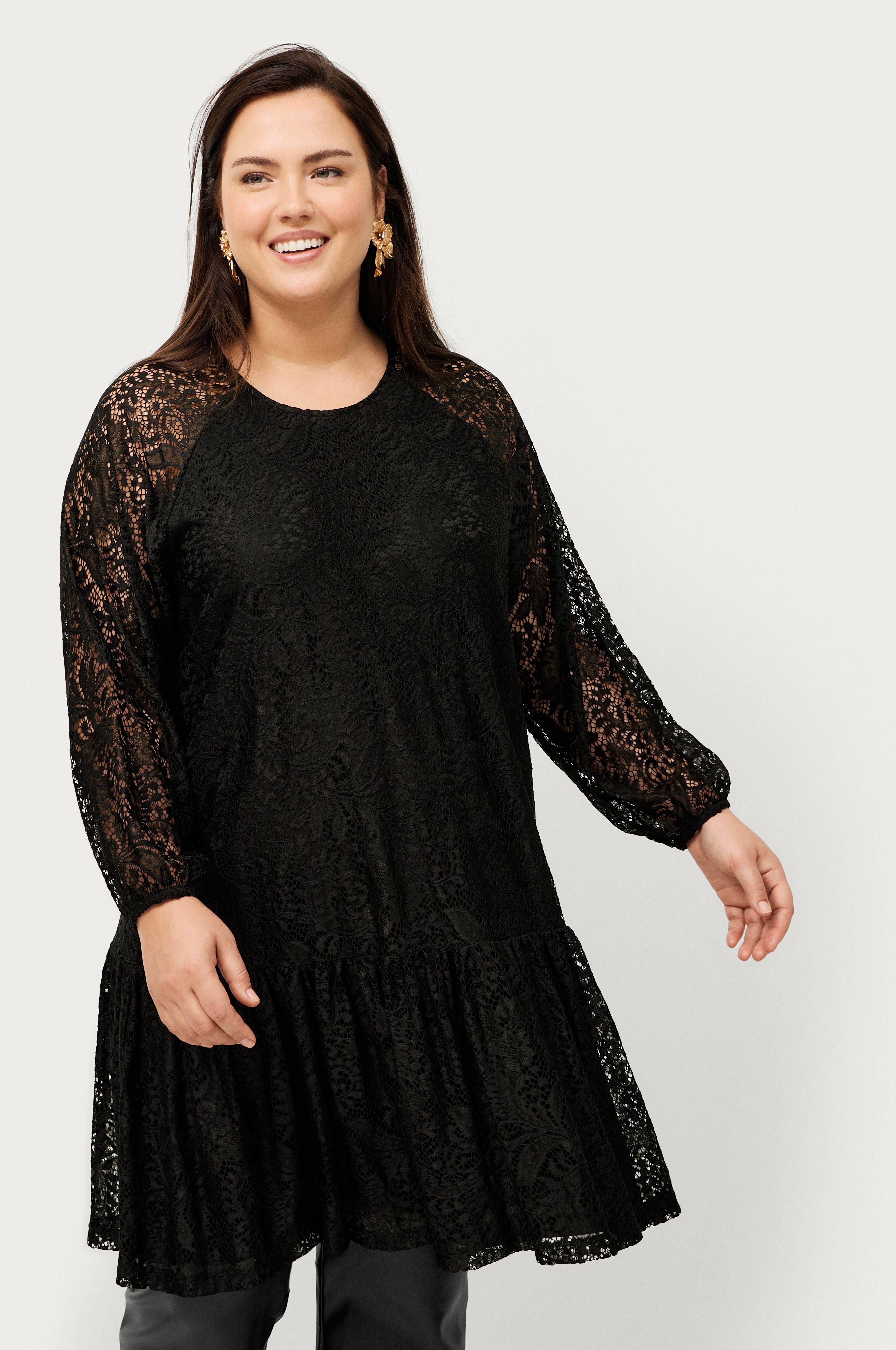 • Stretchig klänning i spets • Rund hals med sprund och knapp bak • Utsvängd modell med volang nedtill • Transparenta ballongärmar med elastiska ärmslut • Sprund med knapp i nacken • Foder i trikå • Längd: 100 cm i storlek 46/48