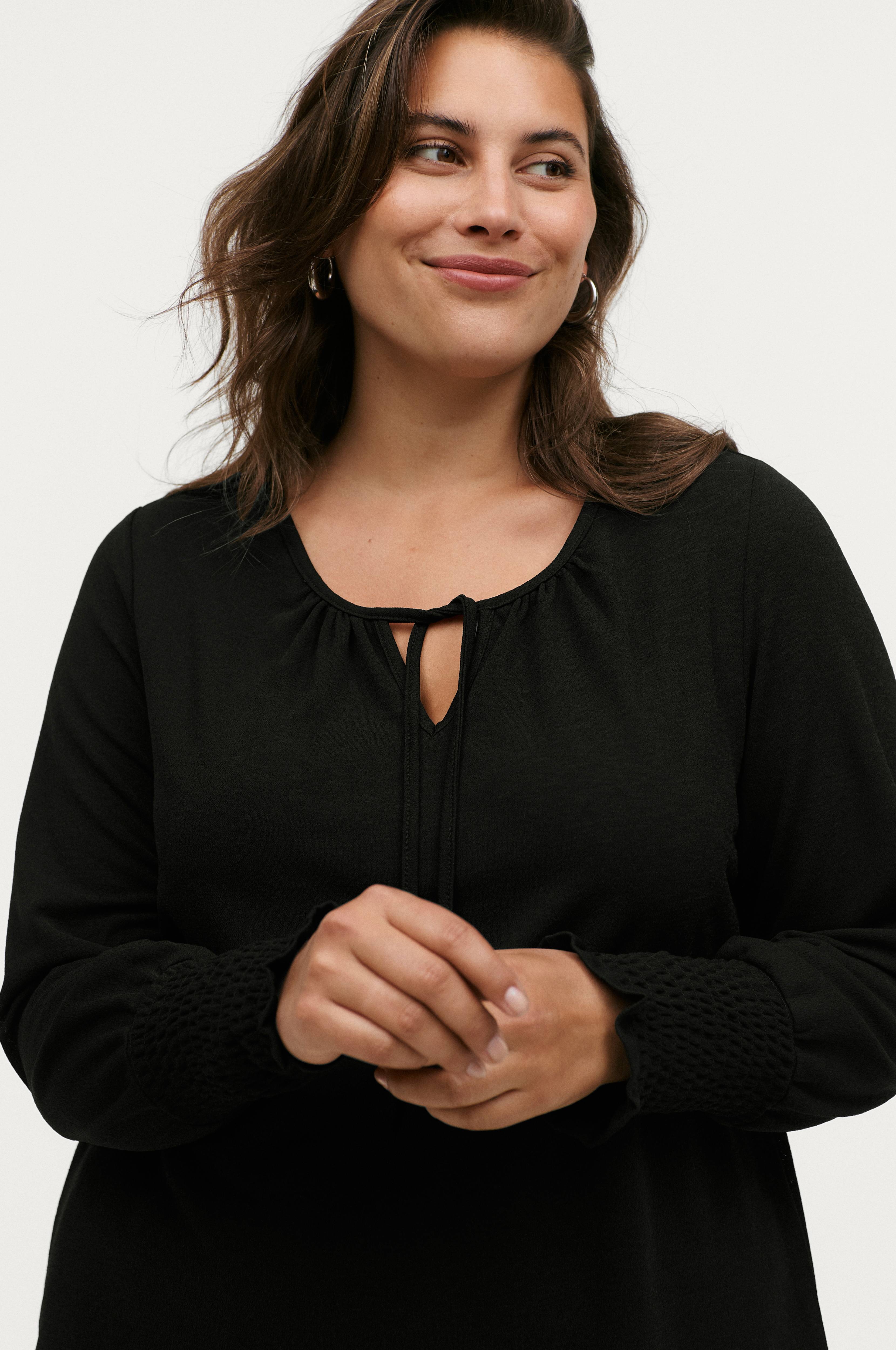 Mjukt tyg som faller fint. Mycket fin fåll på ärmarna. Bra längd, rak form. Rymlig i storlek. Köpte svart, kanske lite transparent, men inte så mycket. Mycket nöjd.