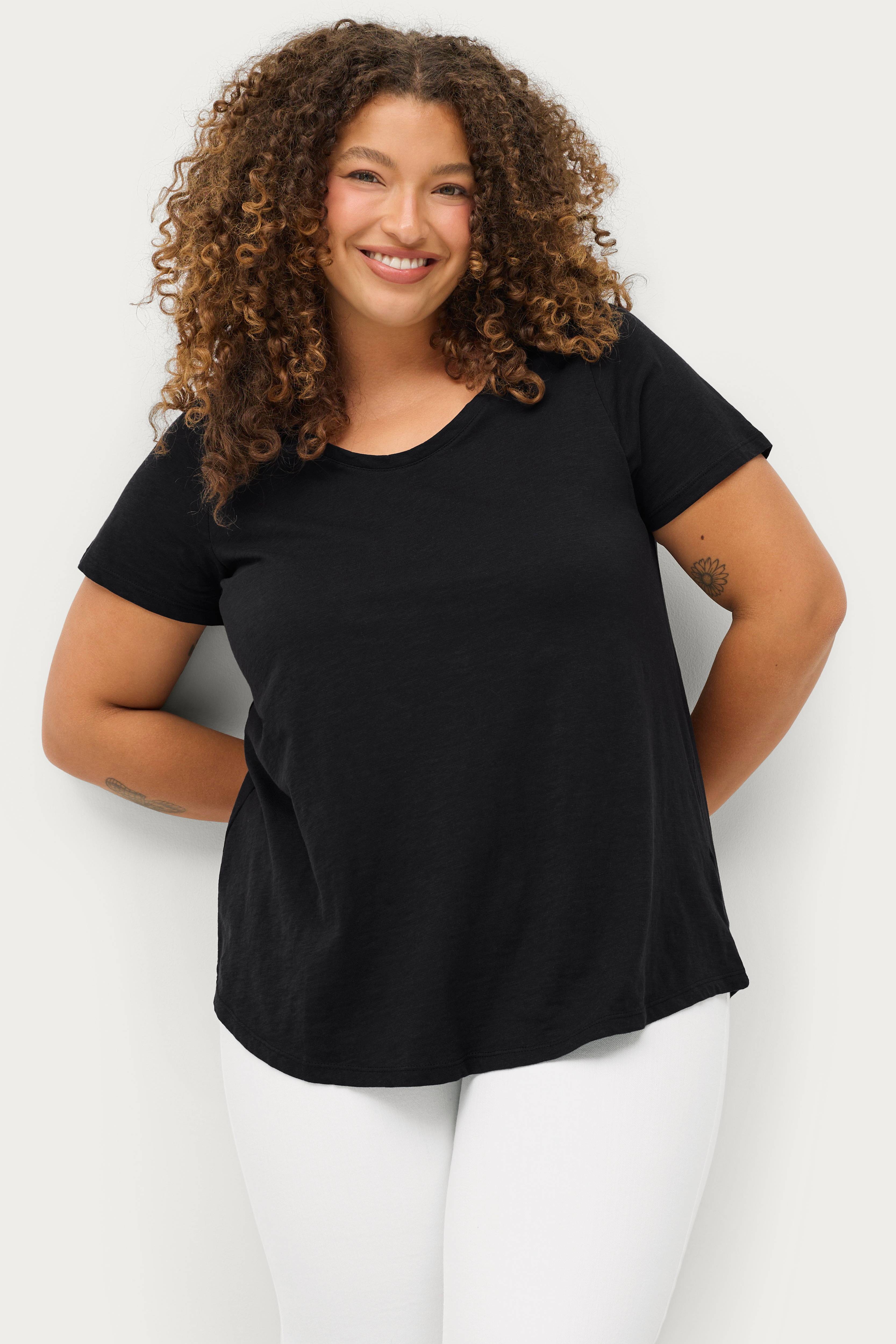 Kortärmad topp Kat i mjuk trikå av bomull i slubkvalitet med lätt, fin struktur. Rund halsringning med finribbad kant. Längd ca 76 cm i stl 46/48.