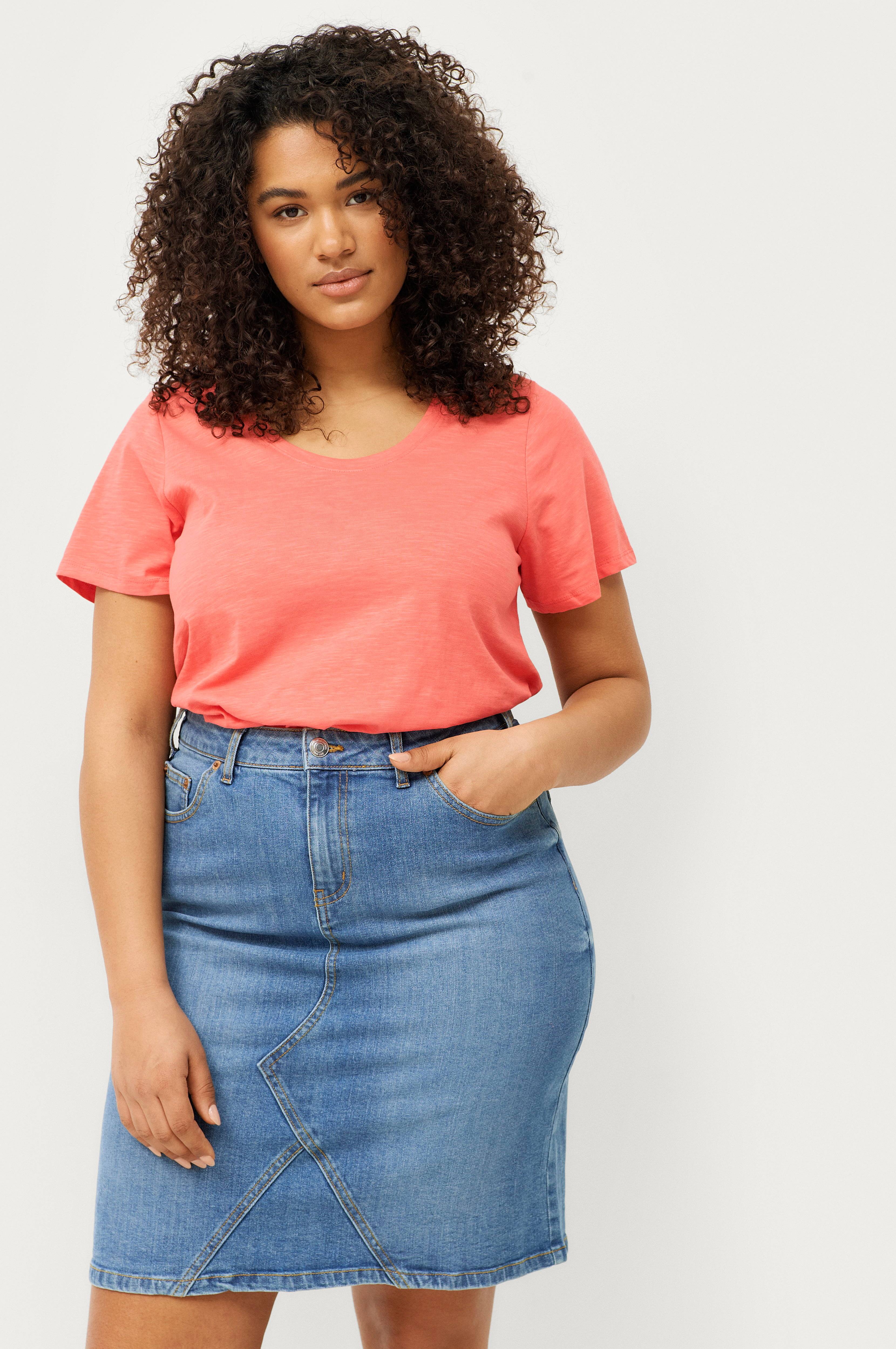 Kortärmad topp Kat i mjuk trikå av bomull i slubkvalitet med lätt, fin struktur. Rund halsringning med finribbad kant. Längd ca 76 cm i stl 46/48.