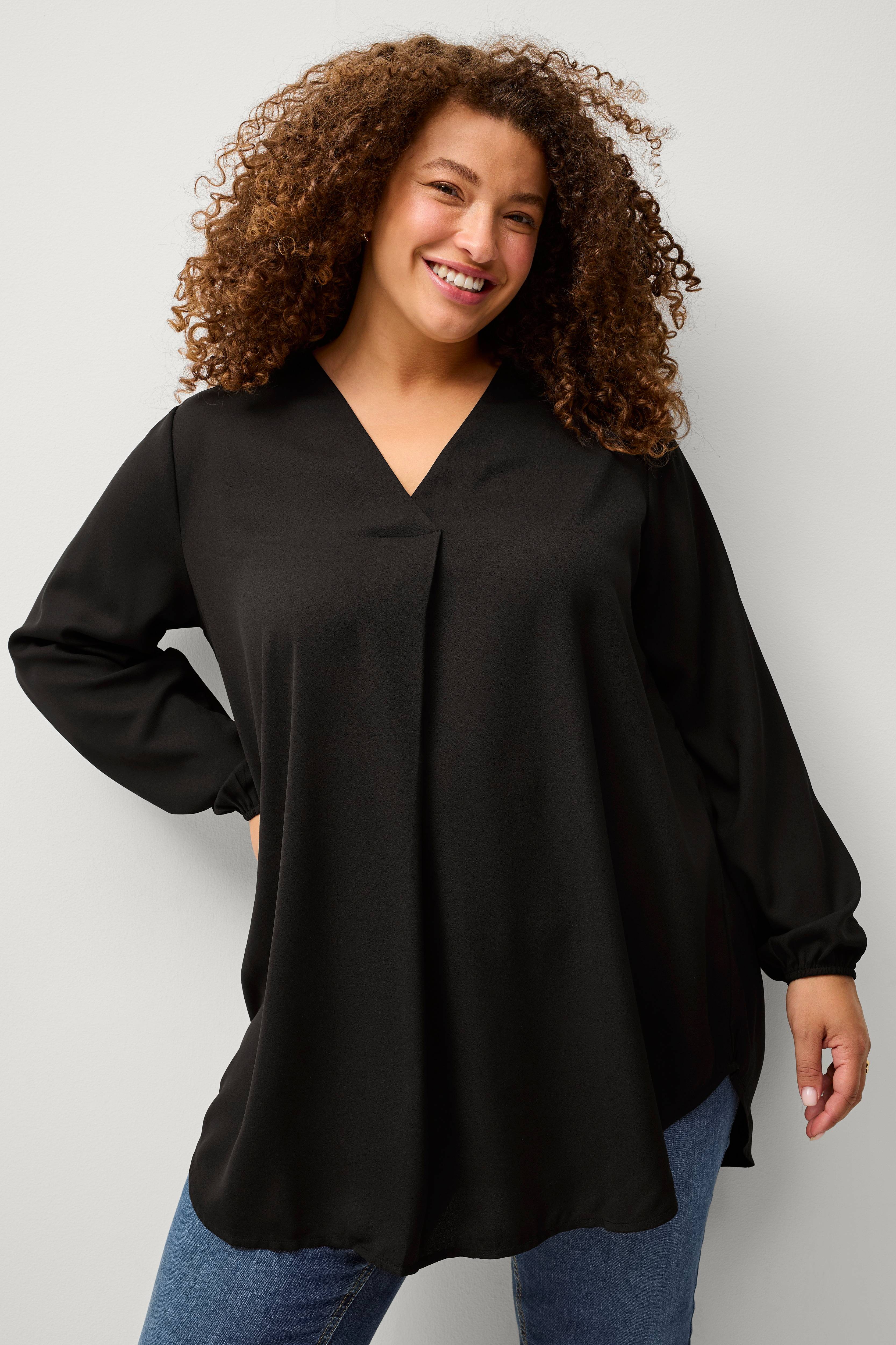 • V-ringad hals • Veck fram • Långa ärmar med resår i ärmsluten • Rundad nederkant • Längd: 88 cm i storlek 46/48 • Produkten innehåller återvunnet material som har tagits tillvara för att minska mängden avfall, samtidigt som nya resurser inte har förbrukats.