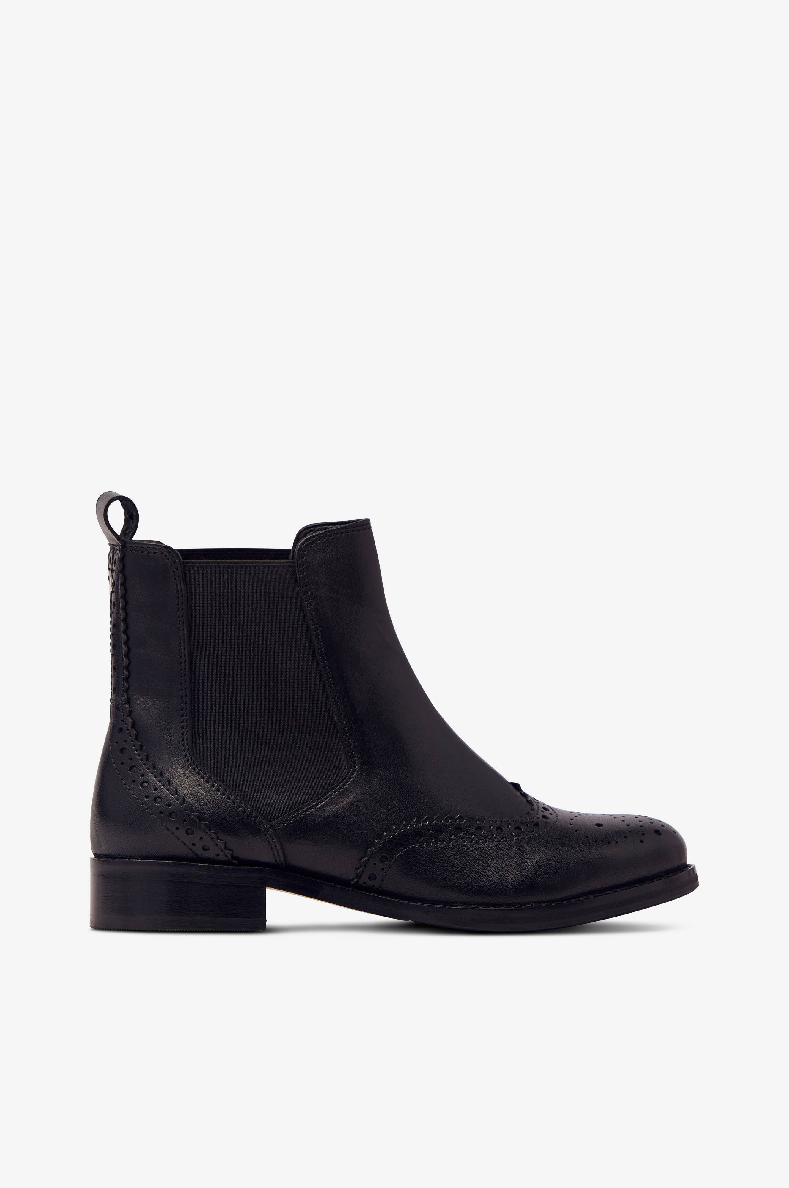 Boots Brogue i skinn. Chelseamodell med broguemönster fram och bak samt bred resårinfällning på båda sidor om skaftet. Liten hank baktill och träliknande klack samt innersula i skinn.