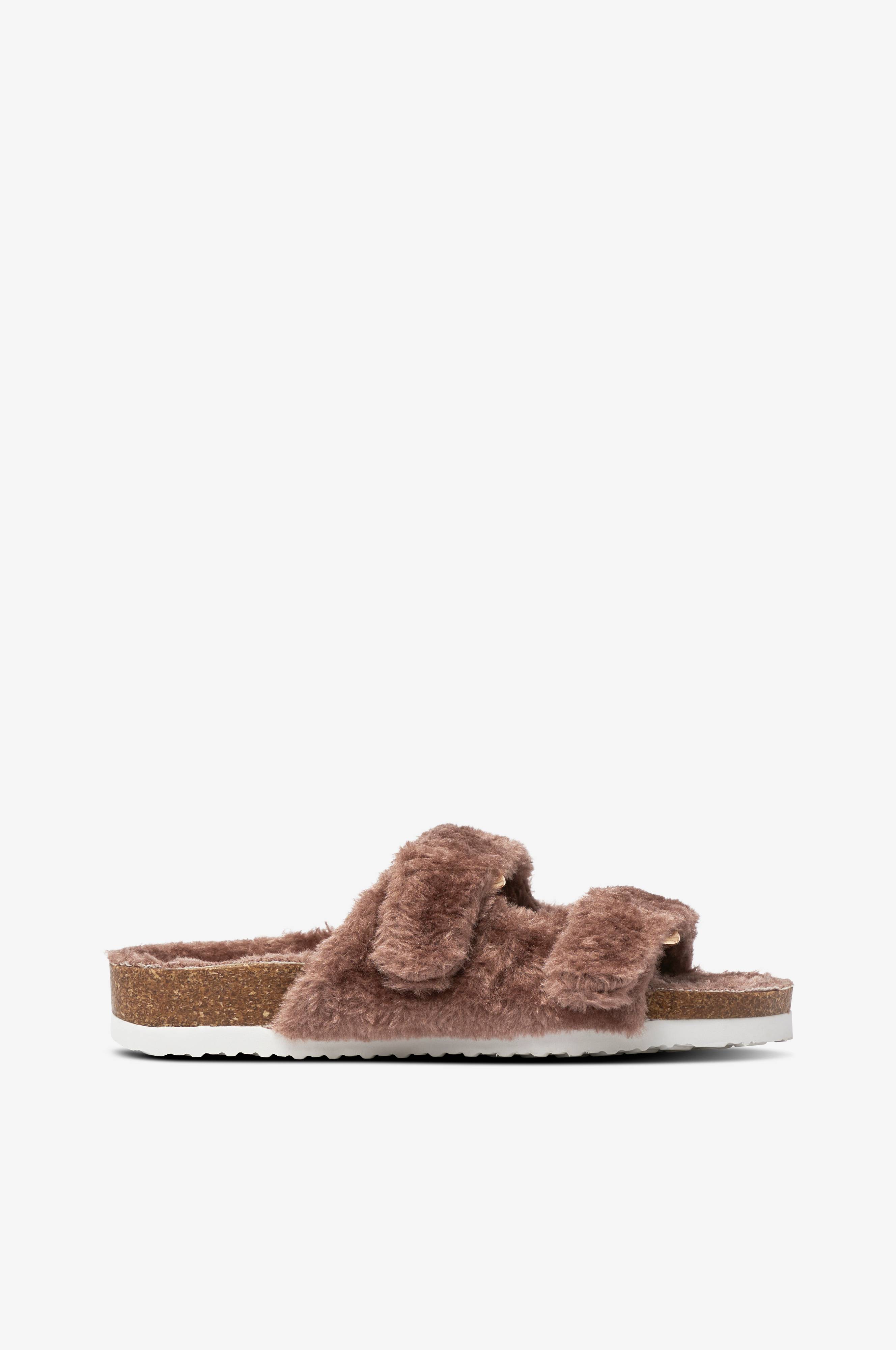 Tofflor i mjuk fuskpäls med justerbara remmar med kardborre och guldfärgat spänne. Mellansula i korklook och yttersula i EVA.