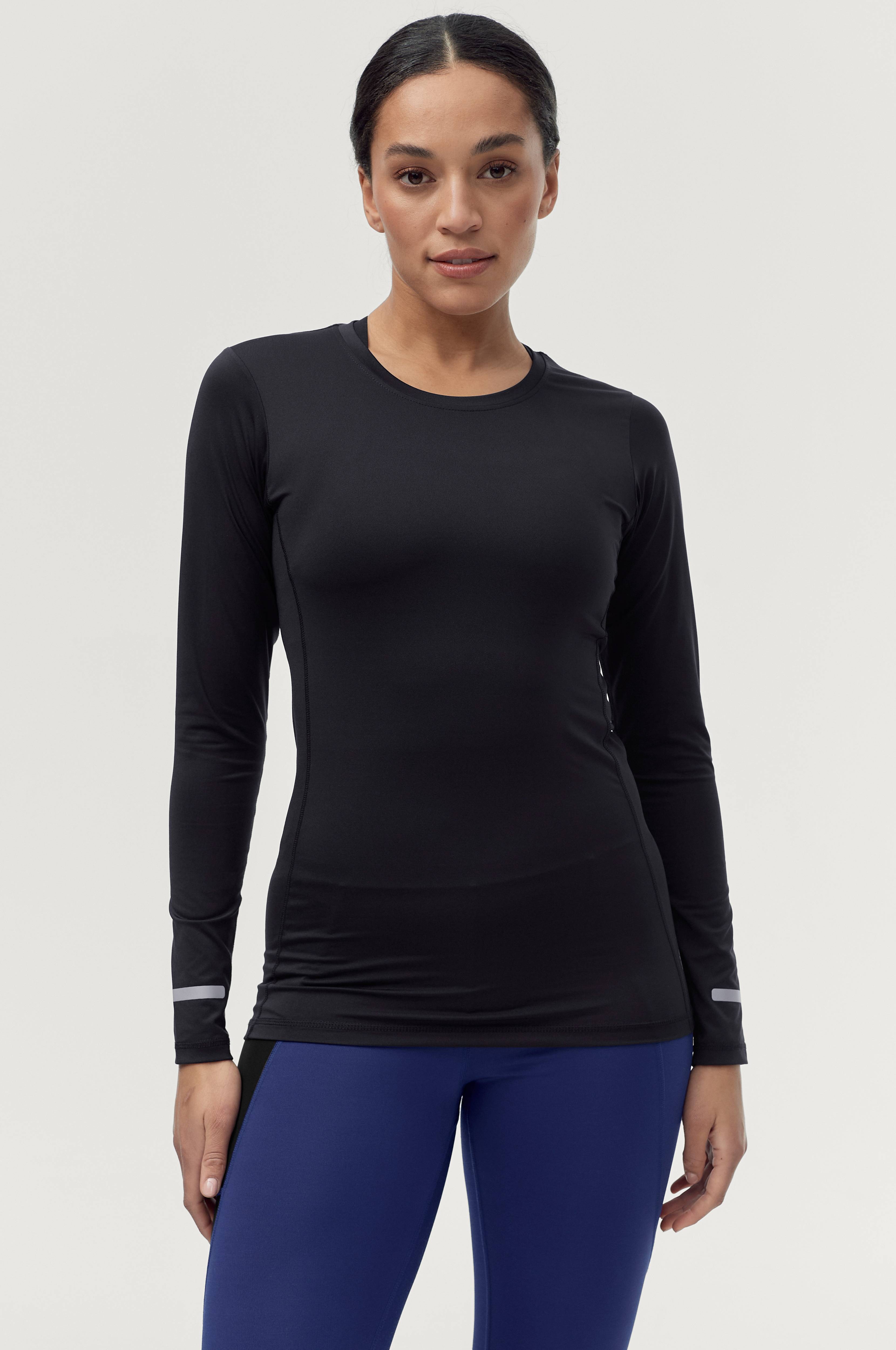 Löpartröja tillverkad det snabbtorkande, stretchiga funktionsmaterialet Fastdry. Lång ärm. Mjuka, platta flatlocksömmar som minimerar risken för skav. Reflextryck på ärmarna och nedtill i den ena sidan. Längre baktill med rundad nederkant. Längd bak ca 70 cm i stl 34/36.