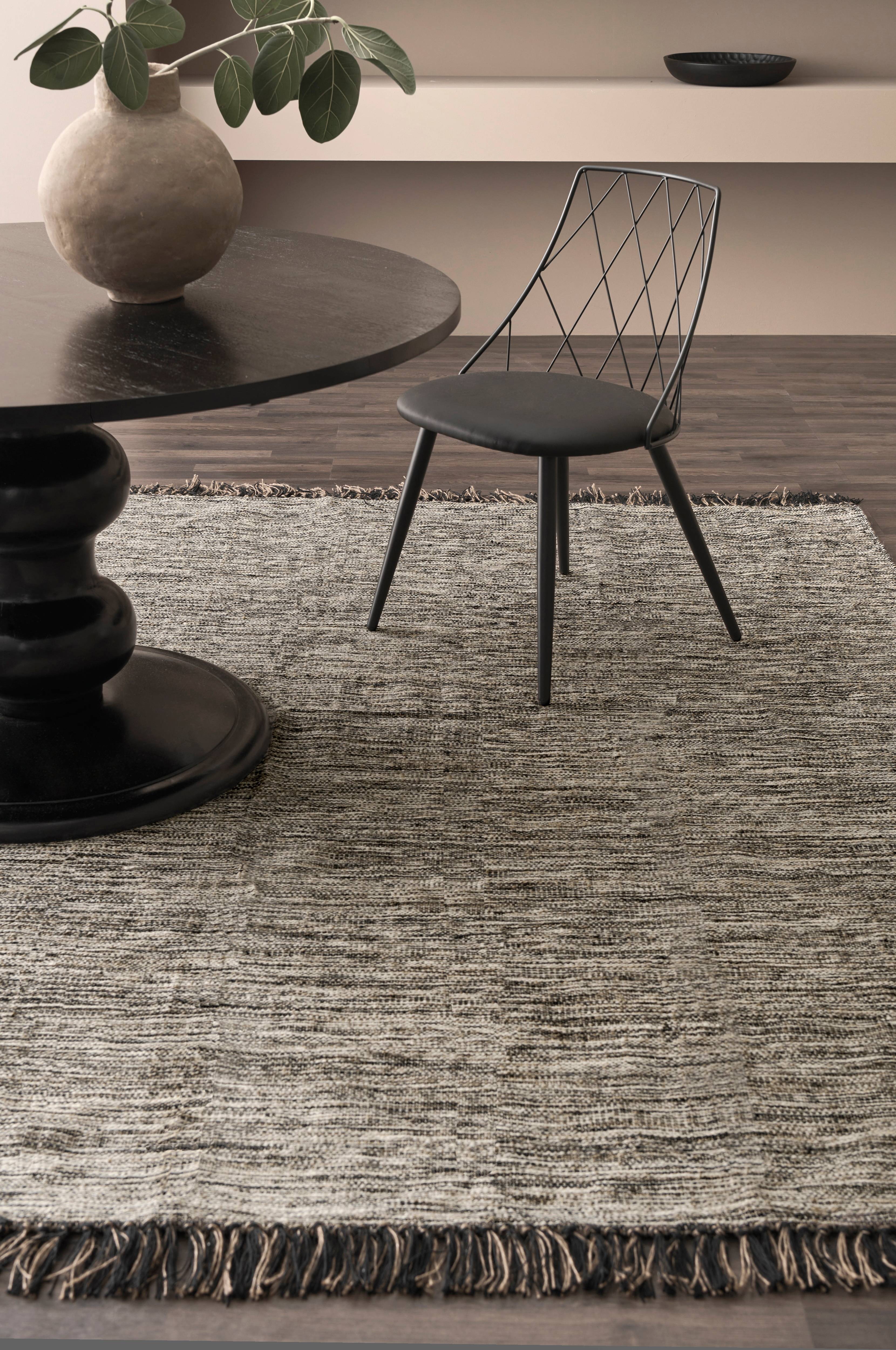 Handvävd, tunn och slät matta i materialmix med bomull, ull och jute. Melerade färger. Fransar på kortsidorna, fransarnas längd 10 cm. Mattans tjocklek ca 0,5 cm.