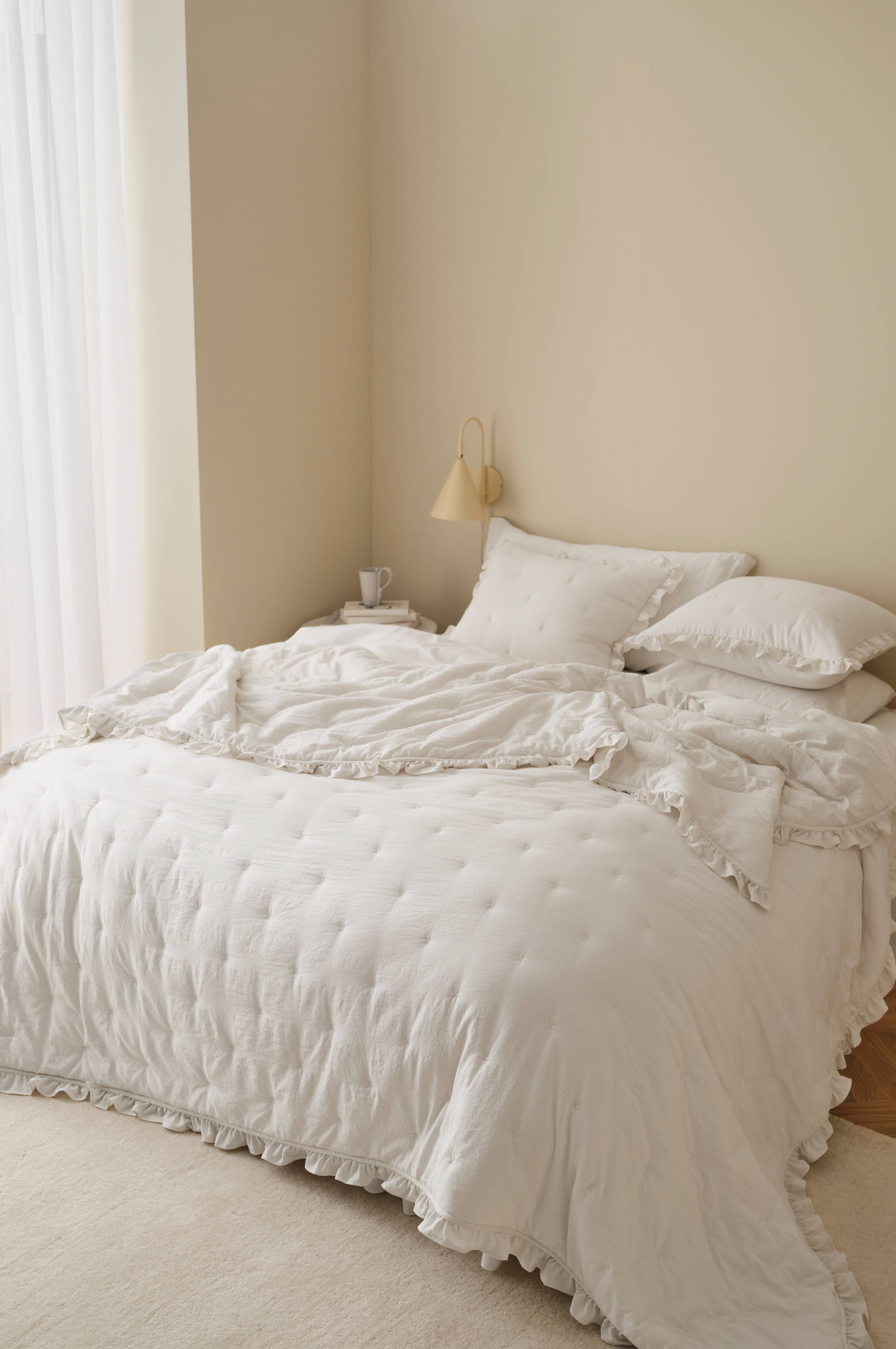 • Quiltat, lätt vadderat överkast • Sydda prickar • Dekorativ volangkant runt om • Överkastet finns i tre storlekar: 150x250 cm (passar säng 90x200 och 105x200 cm) 180x260 cm (passar säng 120x200 och 140x200 cm) 260x260 cm (passar säng 160x200 och 180x200 cm)