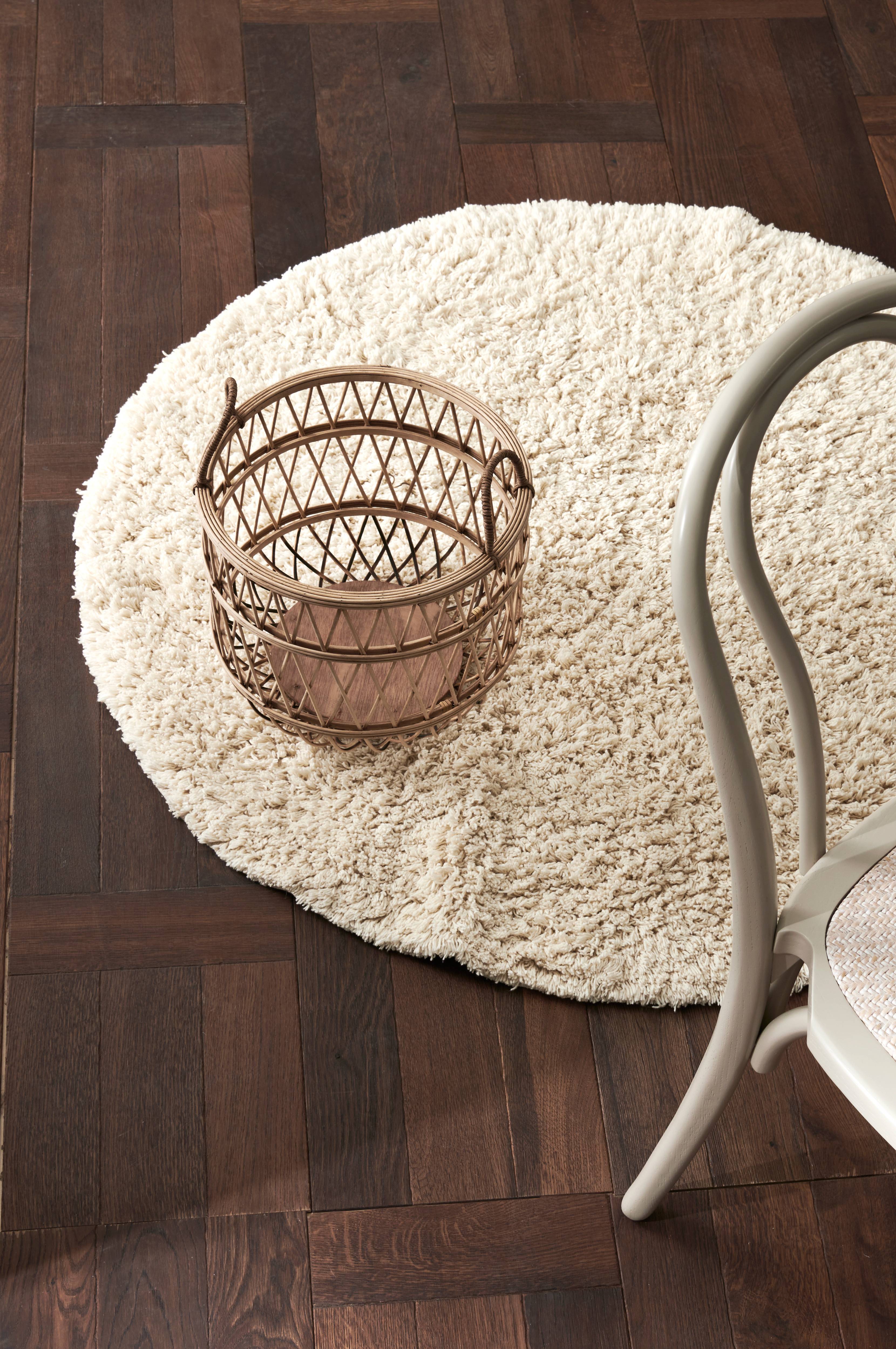 Handtuftad, rund ryamatta i bomull med tät, mjuk lugg som är skön att gå på. Lugghöjd 4 cm.