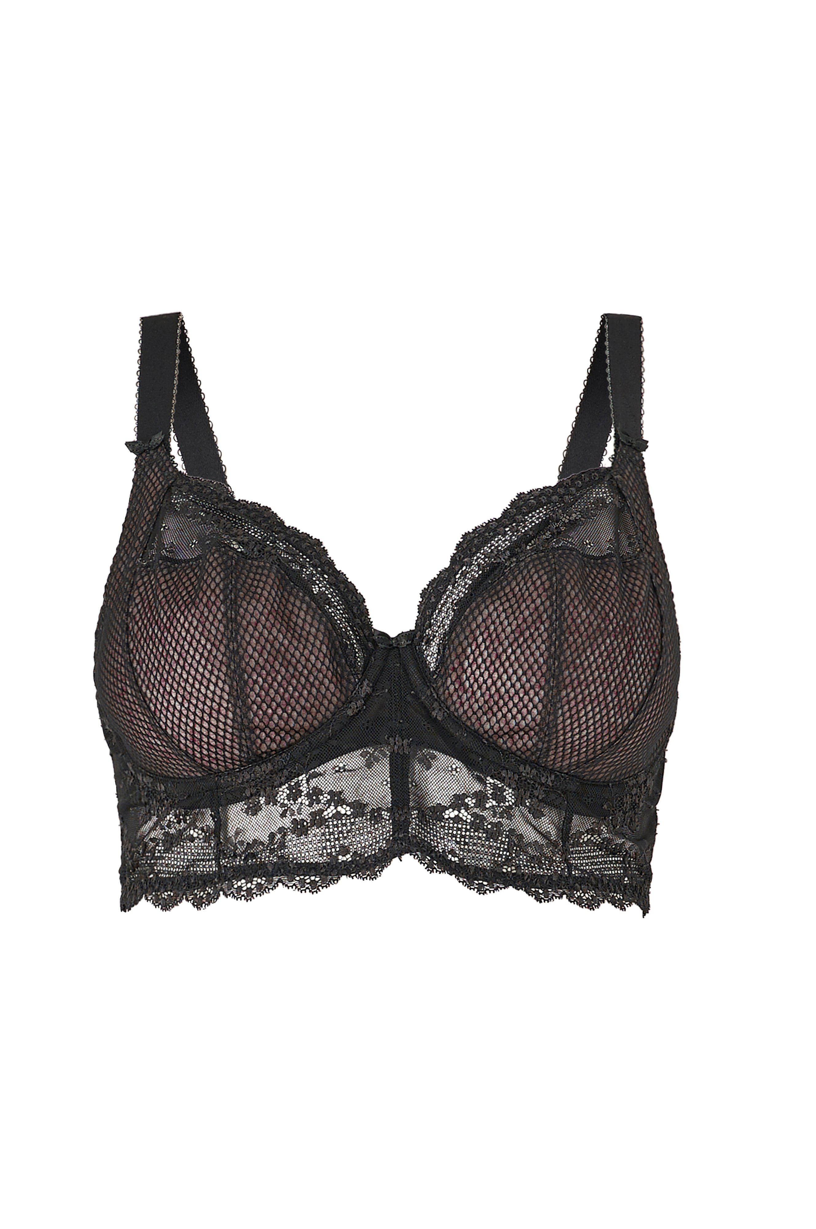 Bralette Charley från Elomi med bygel och tredelade kupor med sidopanel som ger ordentligt stöd och formar/lyfter fint. Kupor i mesh med spets upptill och runtom nedtill. Bred spets i ryggen med hysk- och hakförslutning. Breda, justerbara axelband.