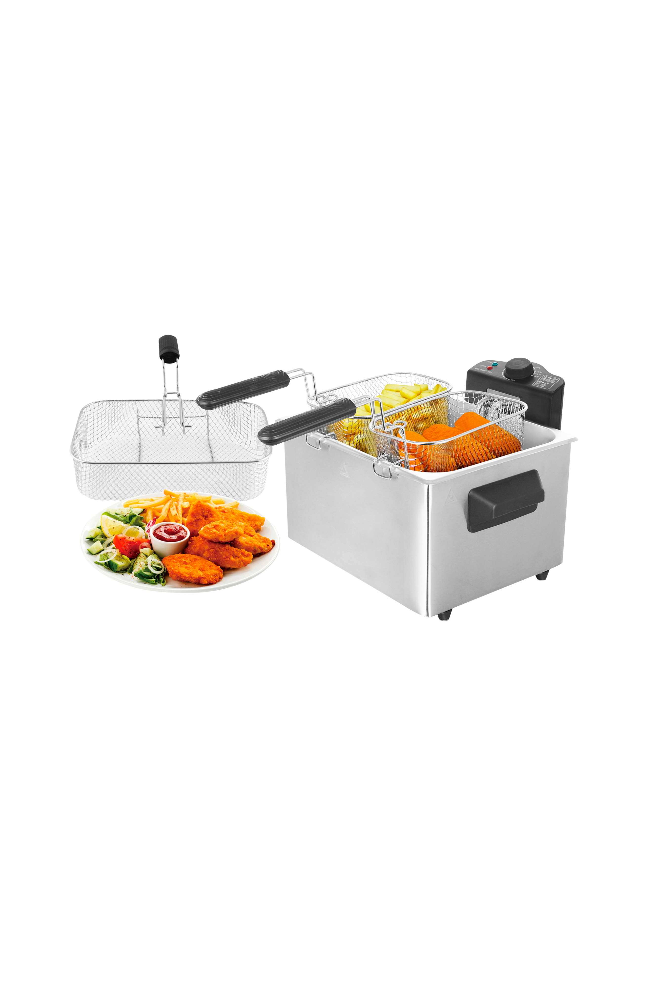 Fritösen är på hela 5 L där du kan fritera till stora familjen samtidigt eller använda de 2 mindre korgarna om man önskar fritera 2 olika saker samtidigt.
